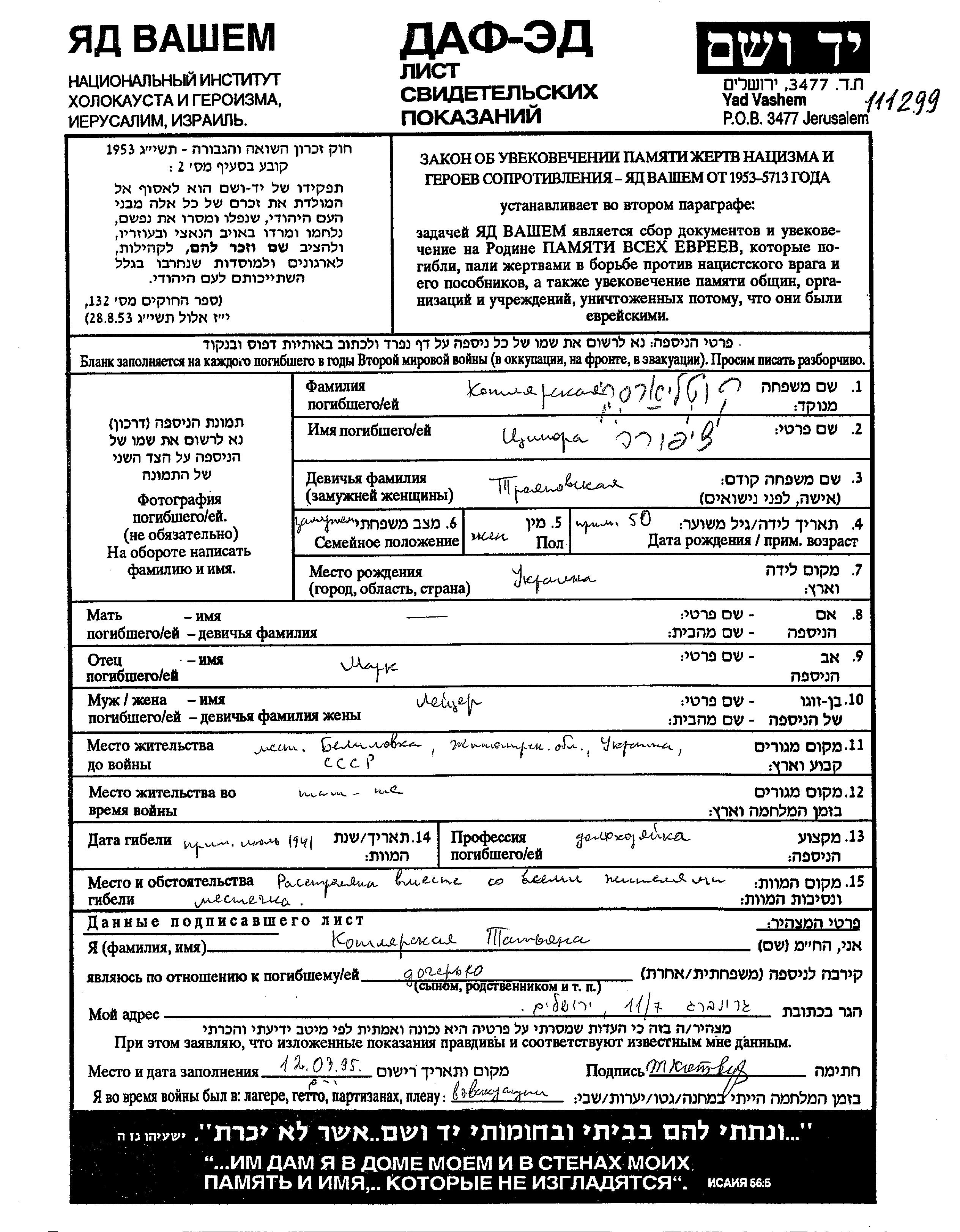 Kotlyarski Tzipora 1891 Belilovka, Ukraine (USSR) Page of Testimony
