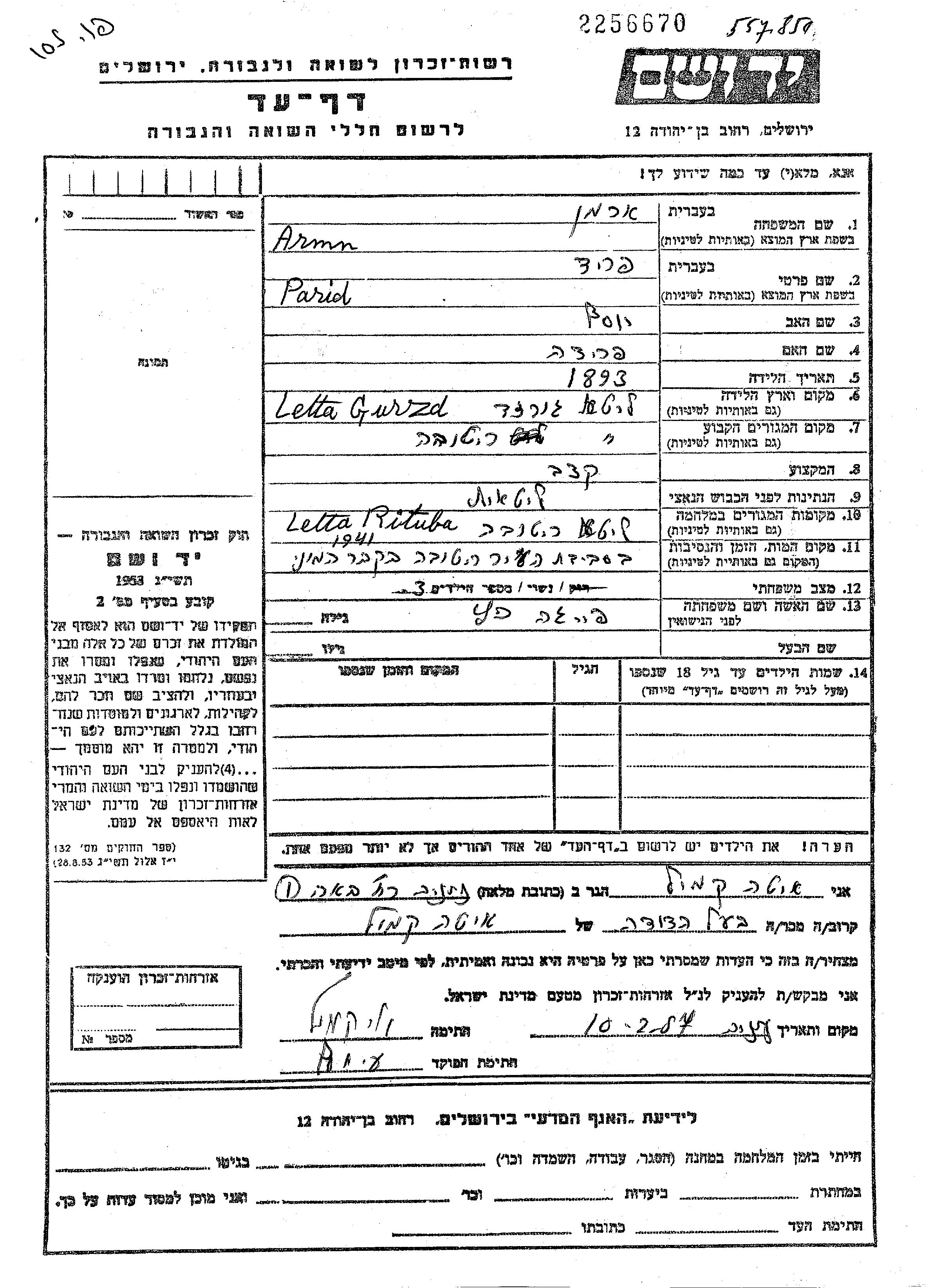 Arman Erman Parid Frid 1893 Ritova, Lithuania Page of Testimony