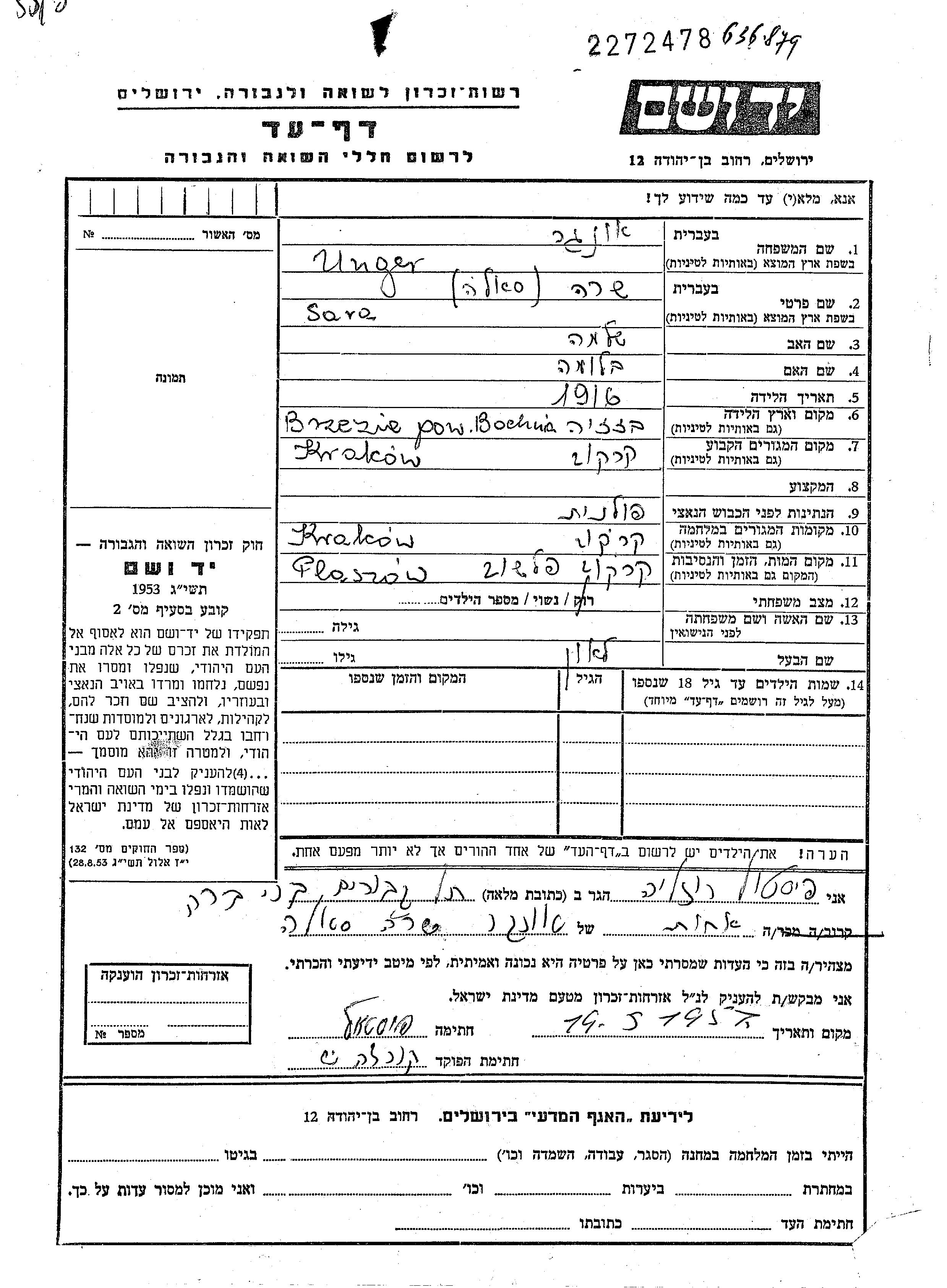 Unger Sara Sala 1916 Krakow, Poland Page of Testimony