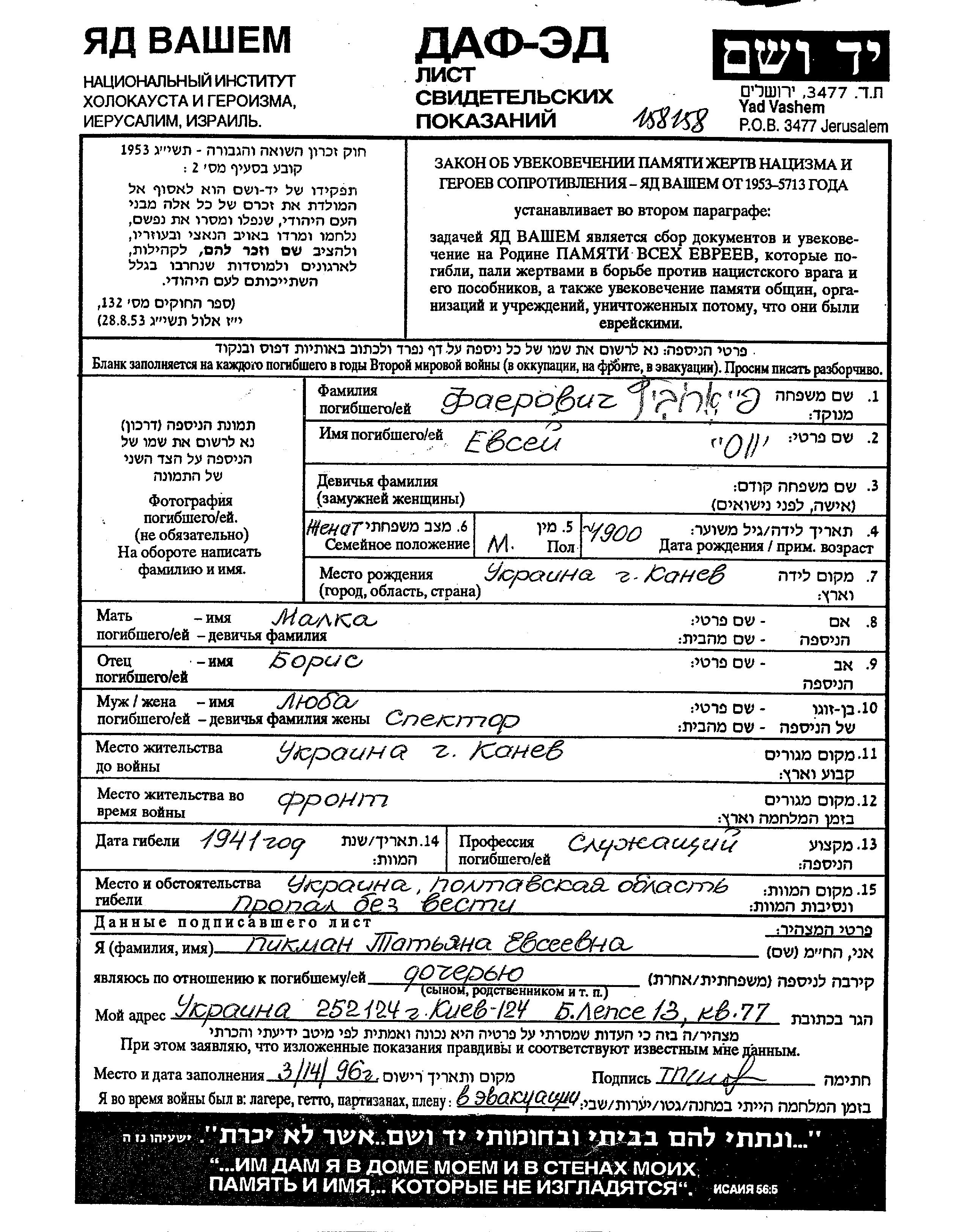 Yevsei Fayerovich was born in Kanev, Ukraine (USSR), 1900 to Boris and Malka. He was a clerk and married to Lyuba. Prior to WWII he lived in Kanev, Ukraine (USSR). During the war he was in the Soviet armed forces. Yevsei was murdered in the Shoah. Place of death: Poltava, Ukraine (USSR), 1941.