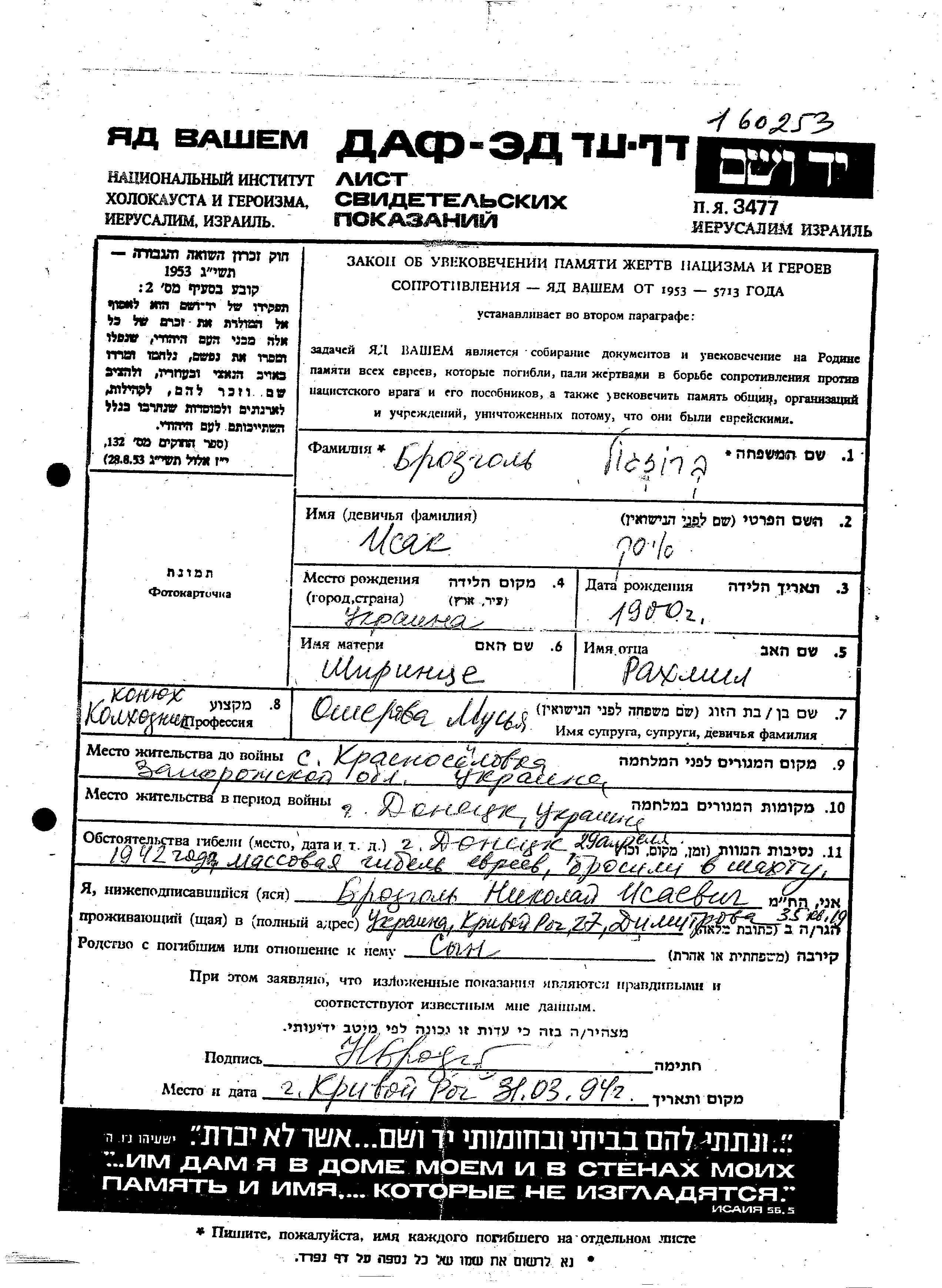 Isak Brozgol was born in Ukraine (USSR), 1900 to Rakhmil and Shprintza. He was a groom and married to Musya. Prior to WWII he lived in Krasnoselovka, Ukraine (USSR). During the war he was in Donetsk, Ukraine (USSR). Isak was murdered in the Shoah. Place of death: Donetsk, Ukraine (USSR), 29/04/1942.