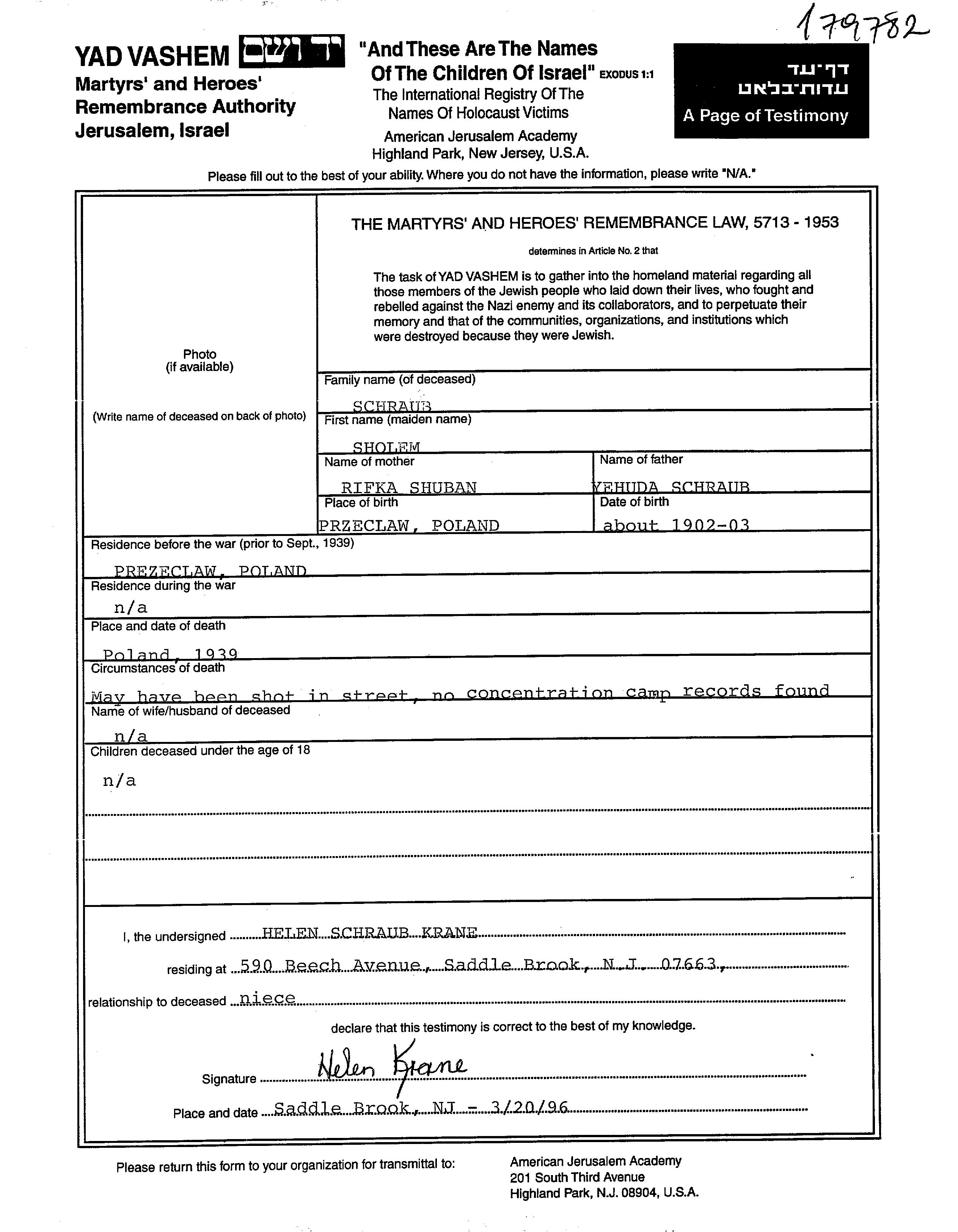 Shulem Schraub was born in Przeclaw, Poland, 1902 to Yehuda and Rifka nee Shuban. Prior to WWII he lived in Przeclaw, Poland. During the war he was in Poland. Shulem was murdered in the Shoah. Place of death: unknown, 1939.