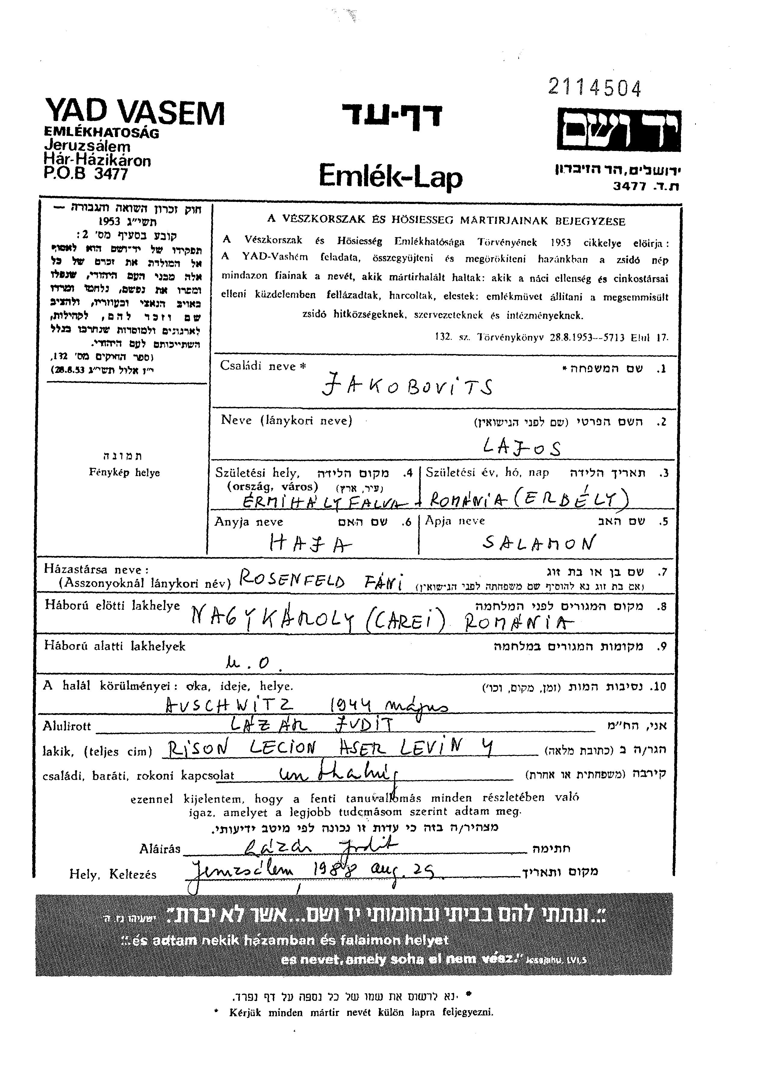 Jakobovits Lajos Nagykaroly, Romania Page of Testimony