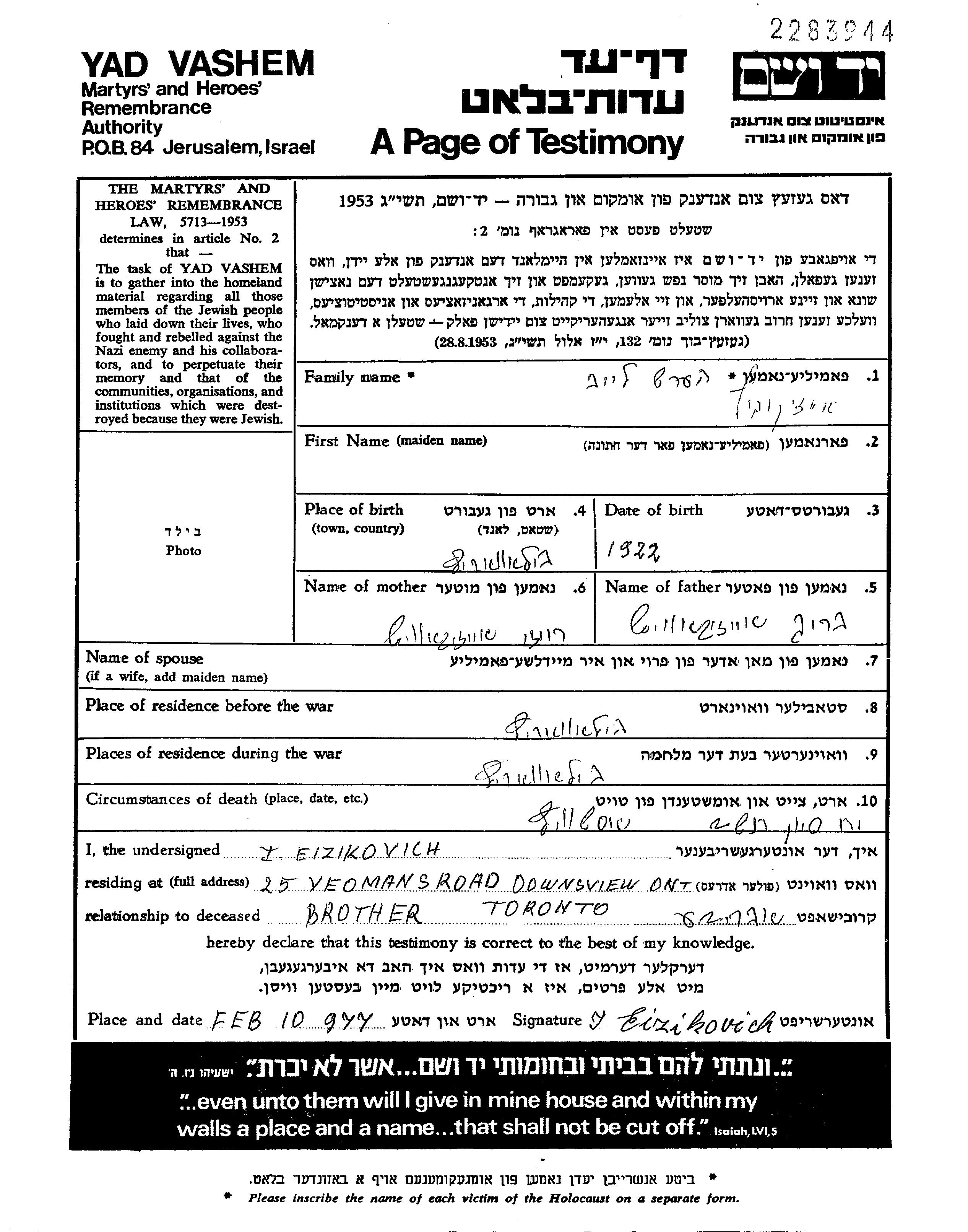 Hersh Leib Eizikovich was born in Belovarec, Czechoslovakia, 1922 to Barukh and Reizi nee Froimovitz. Prior to WWII he lived in Belovarec, Czechoslovakia. During the war he was in Belovarec, Czechoslovakia. Hersh Leib was murdered in the Shoah. Place of death: Auschwitz, Poland, 03/06/1942.