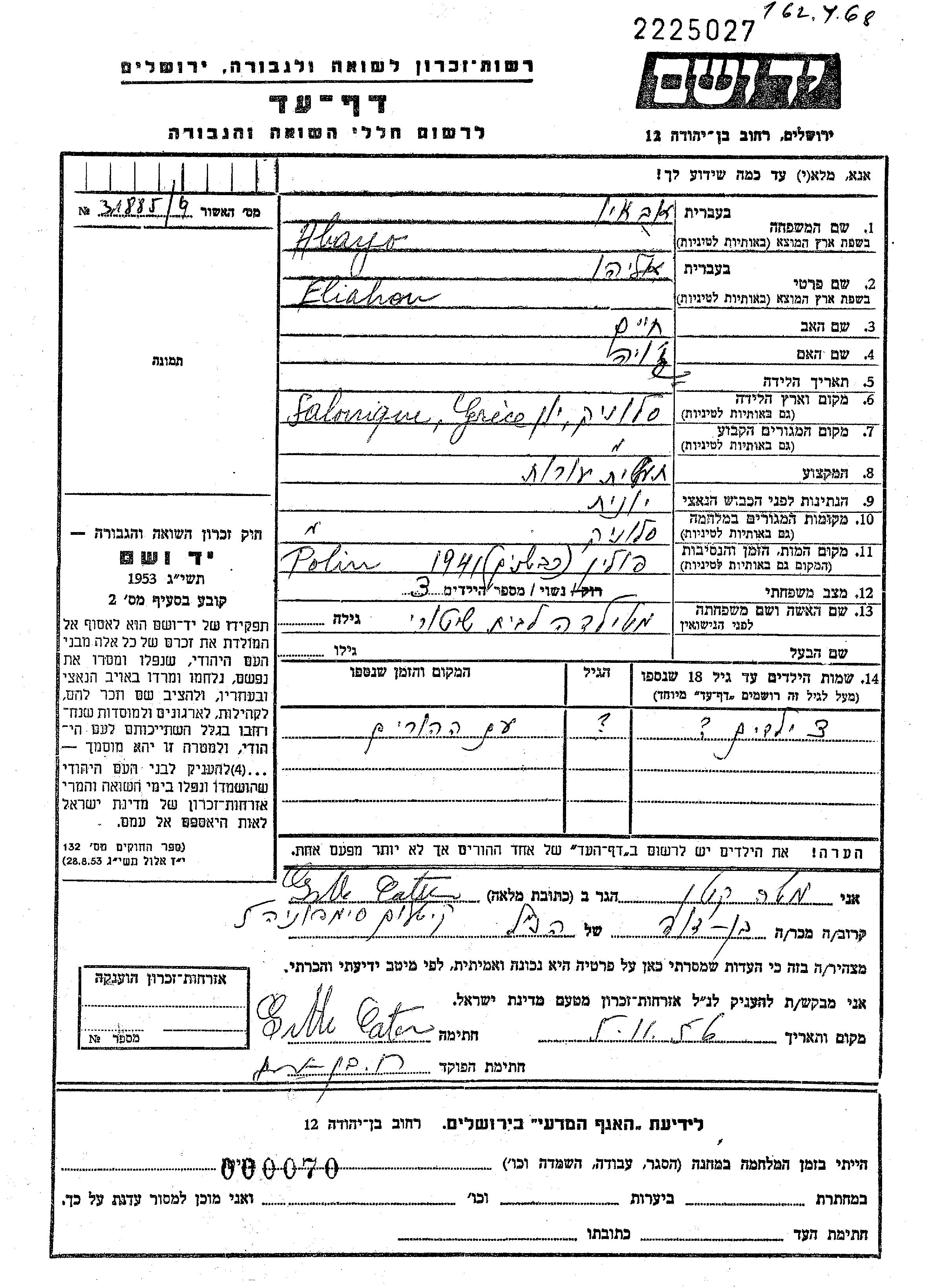Abayo Eliahou Saloniki, Greece Page of Testimony