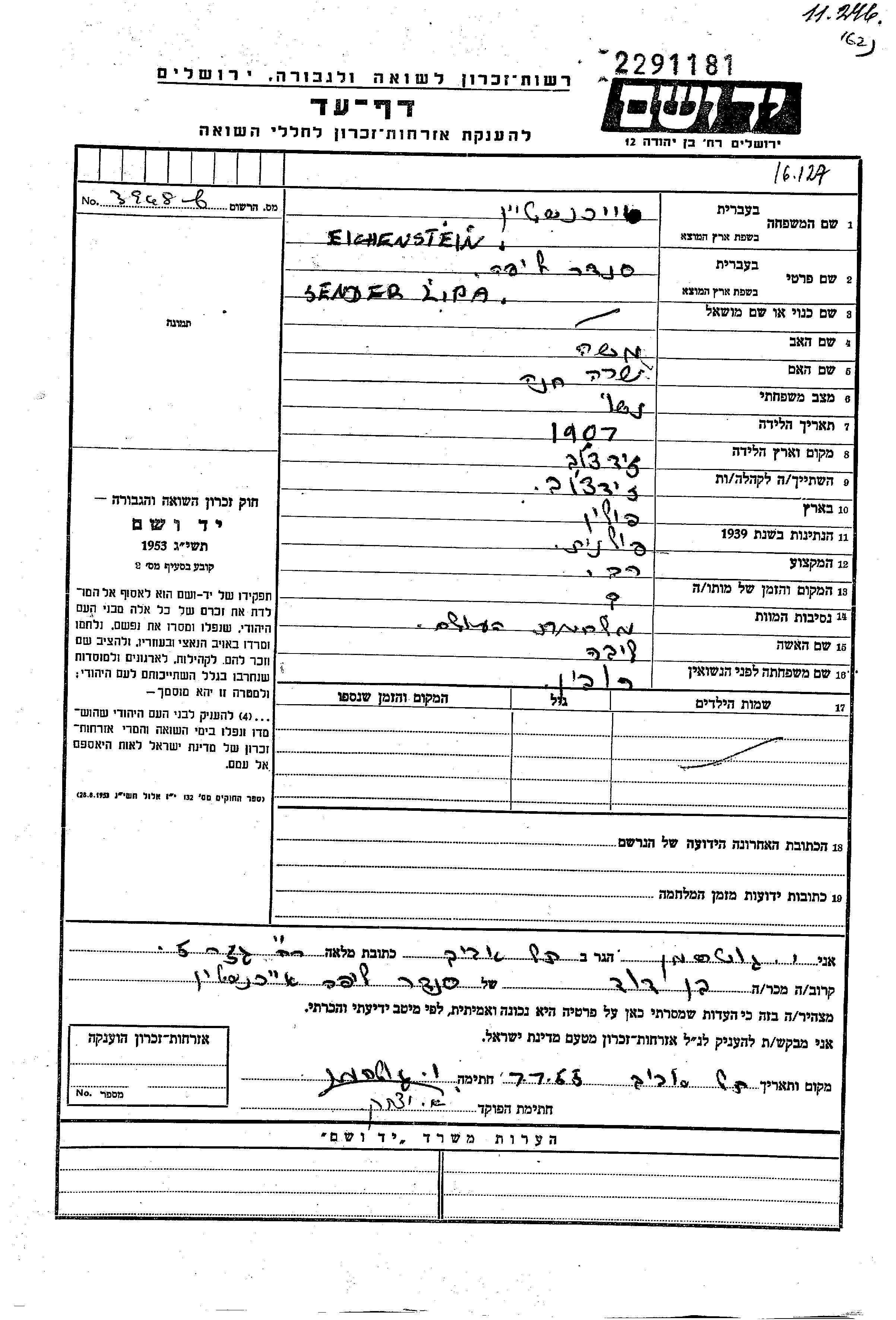 Eichenstein Sender Lipa 1907 Zydaczow, Poland Page of Testimony
