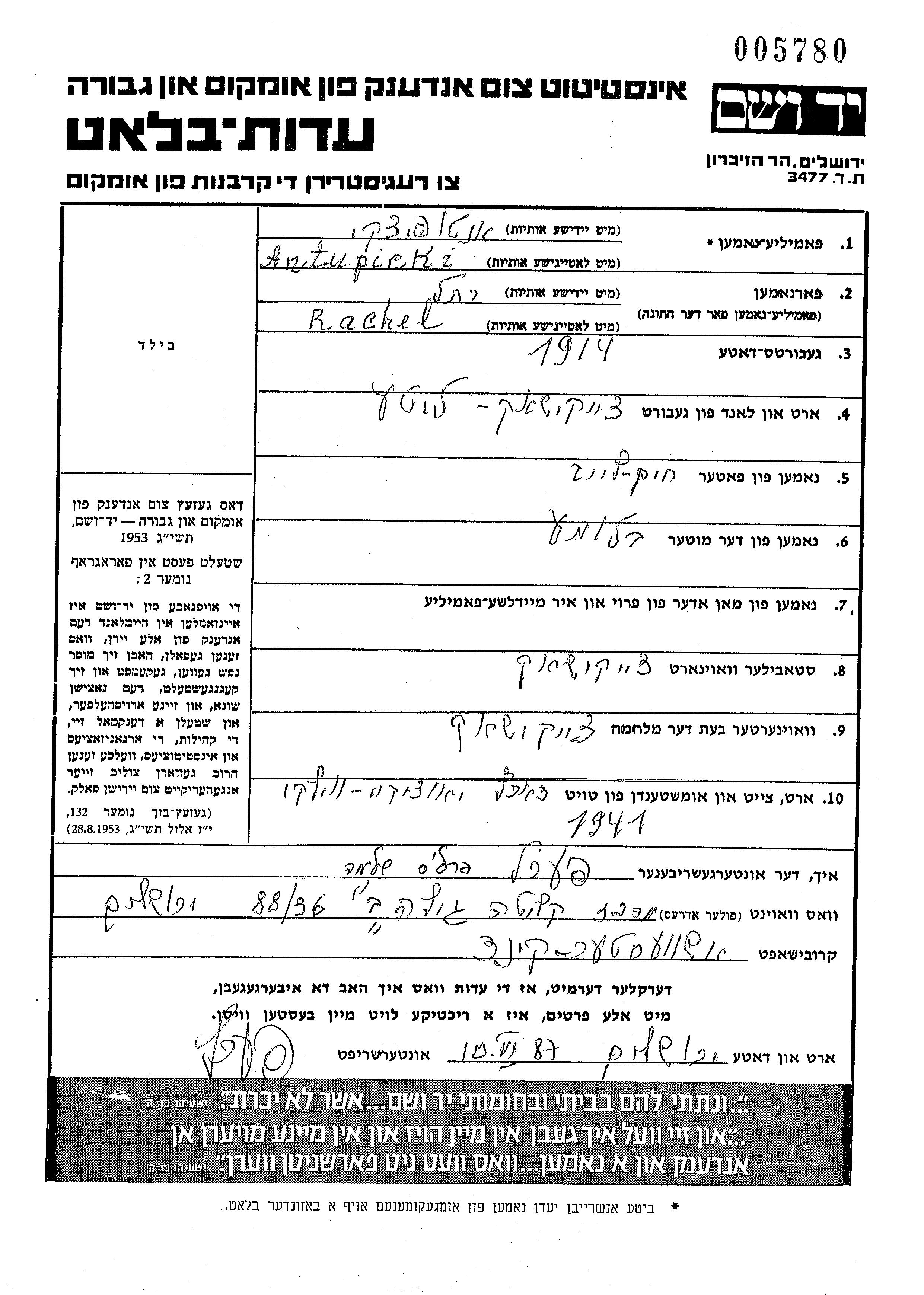 Rachel Antupicki was born in Tzeikishok, Lithuania, 1914 to Chaim Leib and Bluma. Prior to WWII she lived in Tzeikishok, Lithuania. During the war she was in Tzeikishok, Lithuania.
