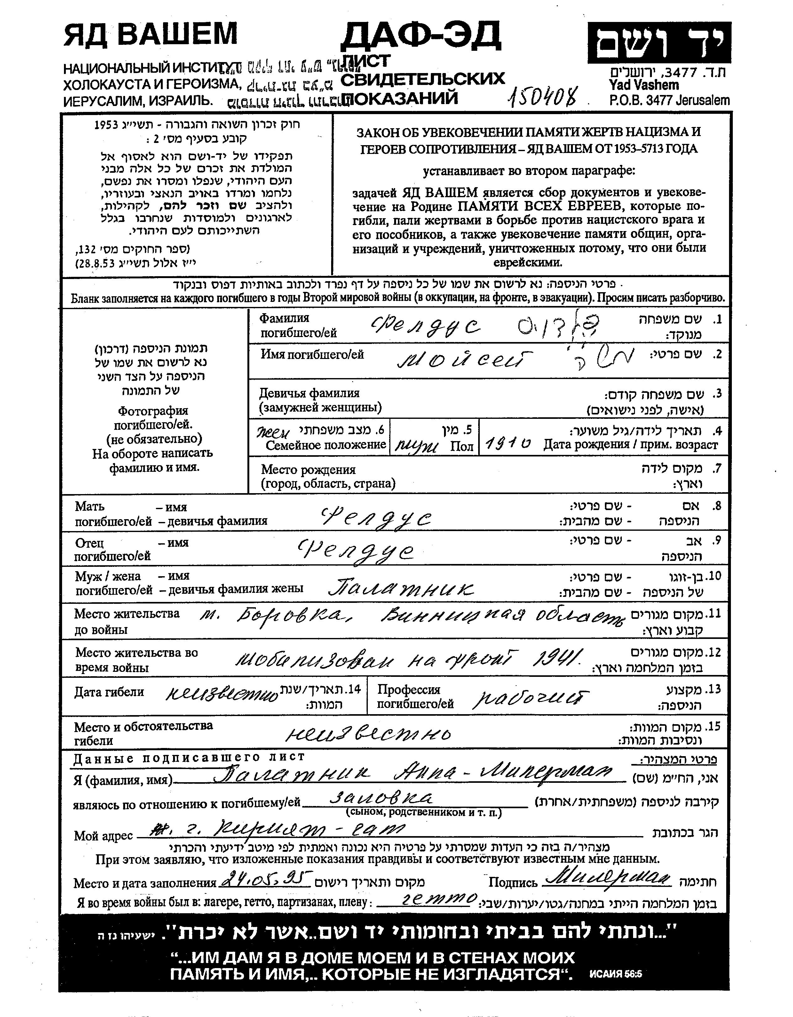 Moisei Feldus was born, 1910. He was a worker. Prior to WWII he lived in Borovka, Ukraine (USSR). During the war he was in the Soviet armed forces. Moisei was killed in military service in WWII.
