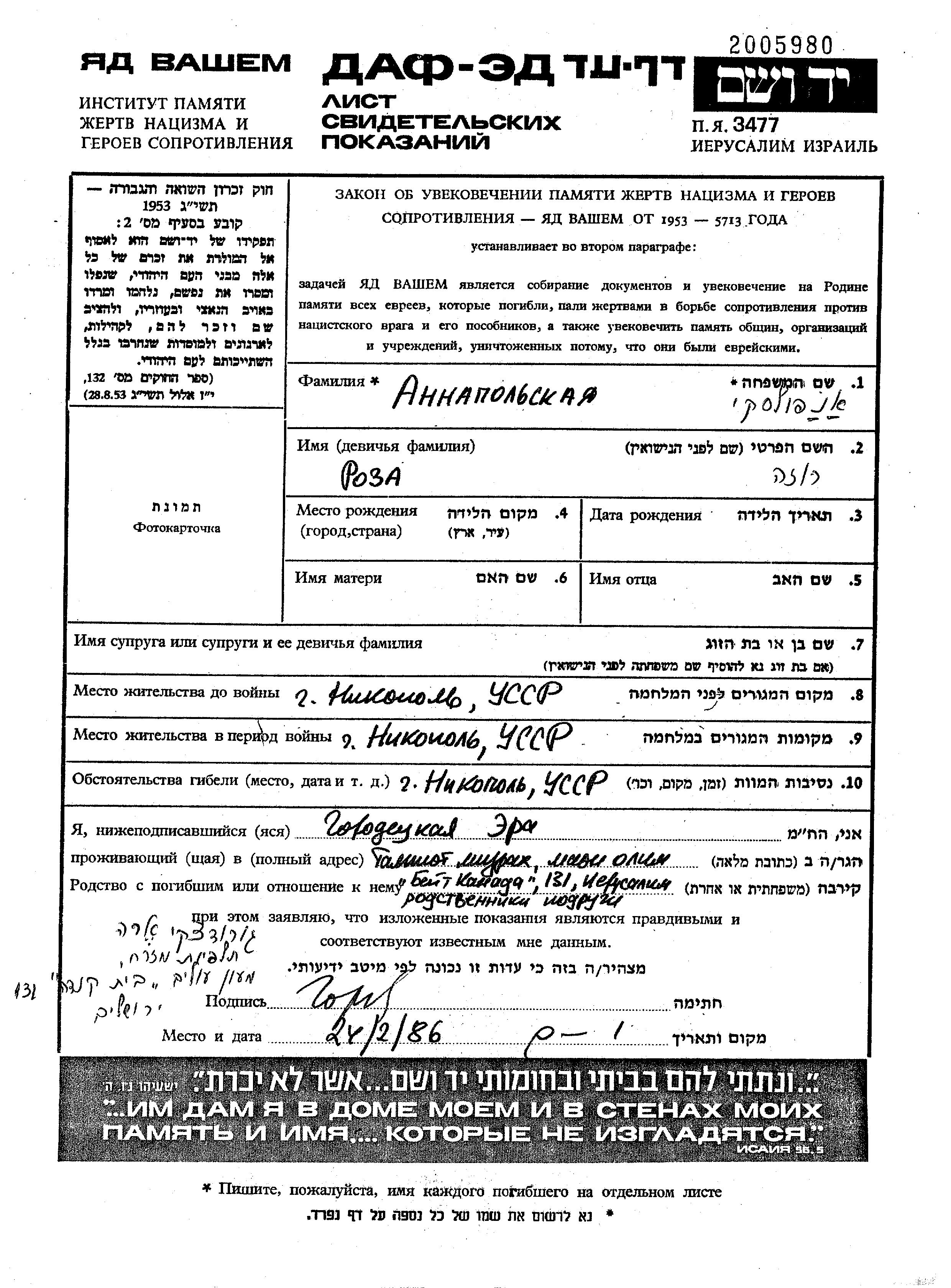 Roza Anapolski. Prior to WWII she lived in Nikopol, Ukraine (USSR). During the war she was in Nikopol, Ukraine (USSR). Roza was murdered in the Shoah. Place of death: Nikopol, Ukraine (USSR).
