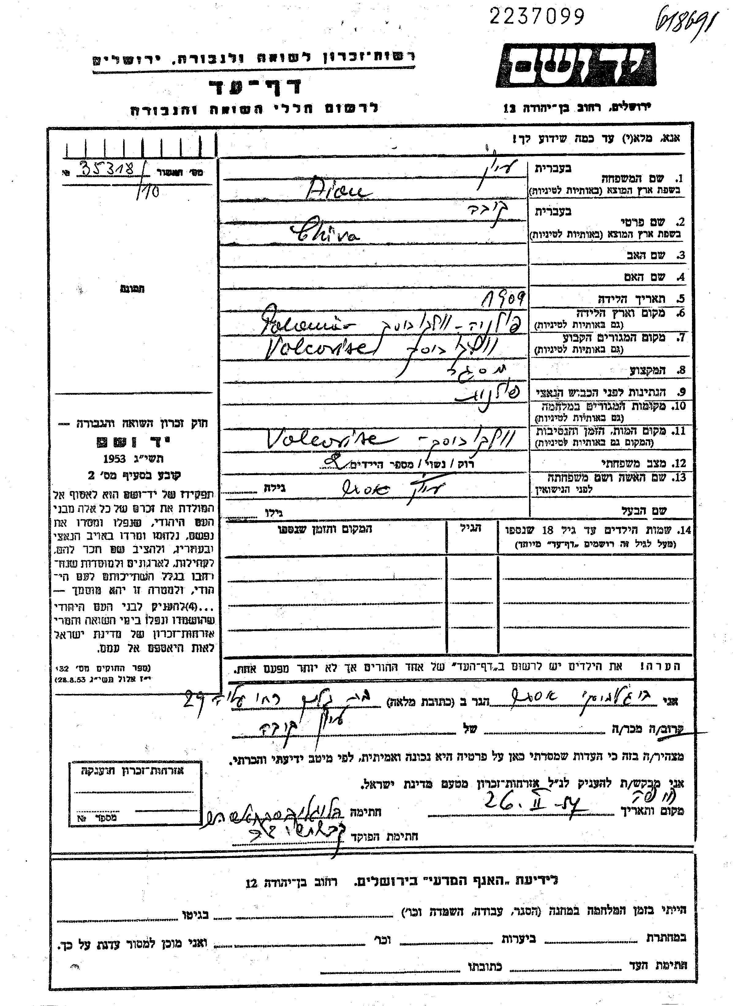 Aion Ajun Chiva 1909 Wolkowysk, Poland Page of Testimony