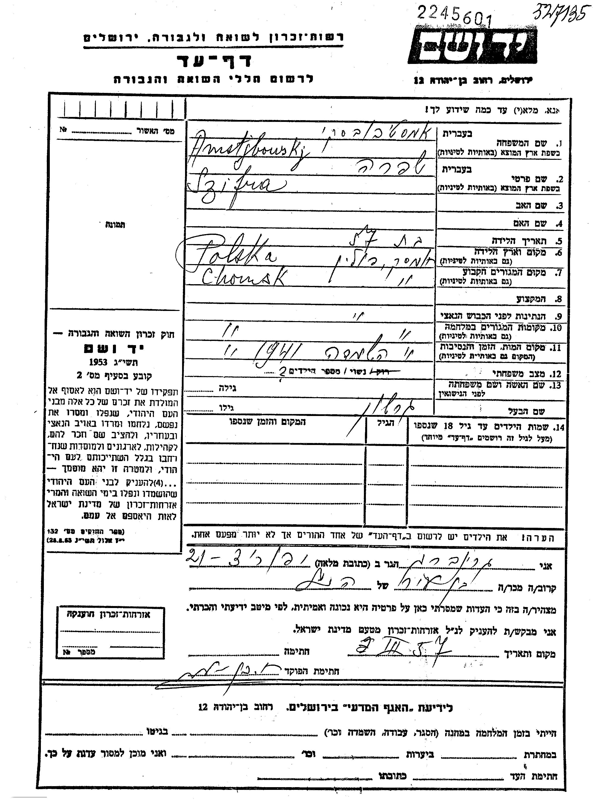 Szifra Amstjbowskj Amstibovski was born in Chomsk, Poland. She was married to Gerszon. Prior to WWII she lived in Chomsk, Poland. During the war she was in Chomsk, Poland. Szifra was murdered in the Shoah. Place of death: Chomsk, Poland, 1941.