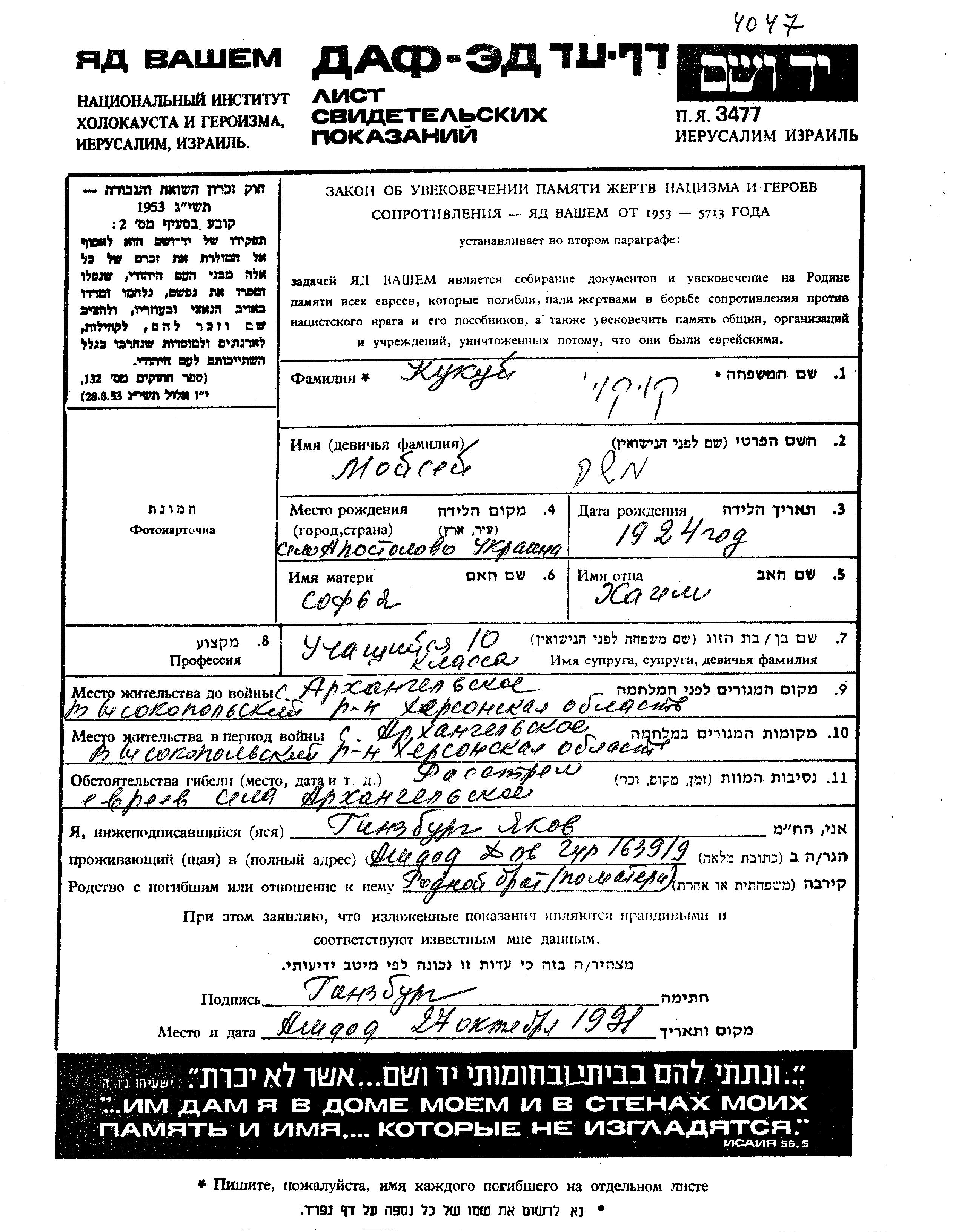 Kukui Moisei 1924 Arkhangelskoye, Ukraine (USSR) Page of Testimony
