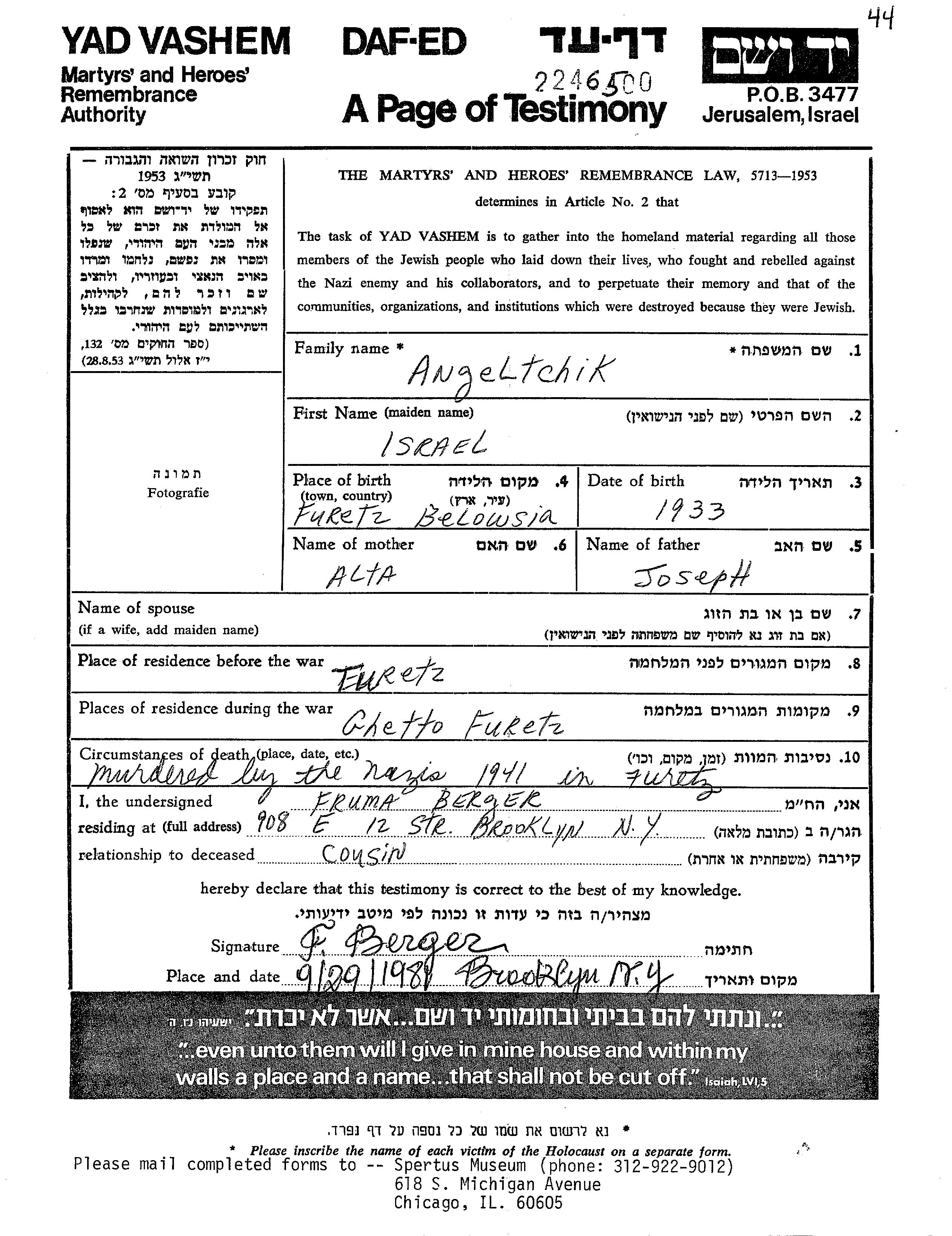 Israel Angeltchik was born in Turetz, Poland, 1933 to Joseph and Alta nee Green. He was child. Prior to WWII he lived in Turetz, Poland. During the war he was in Turetz, Poland. Israel was murdered in the Shoah. Place of death: Turetz, Poland, 1941.