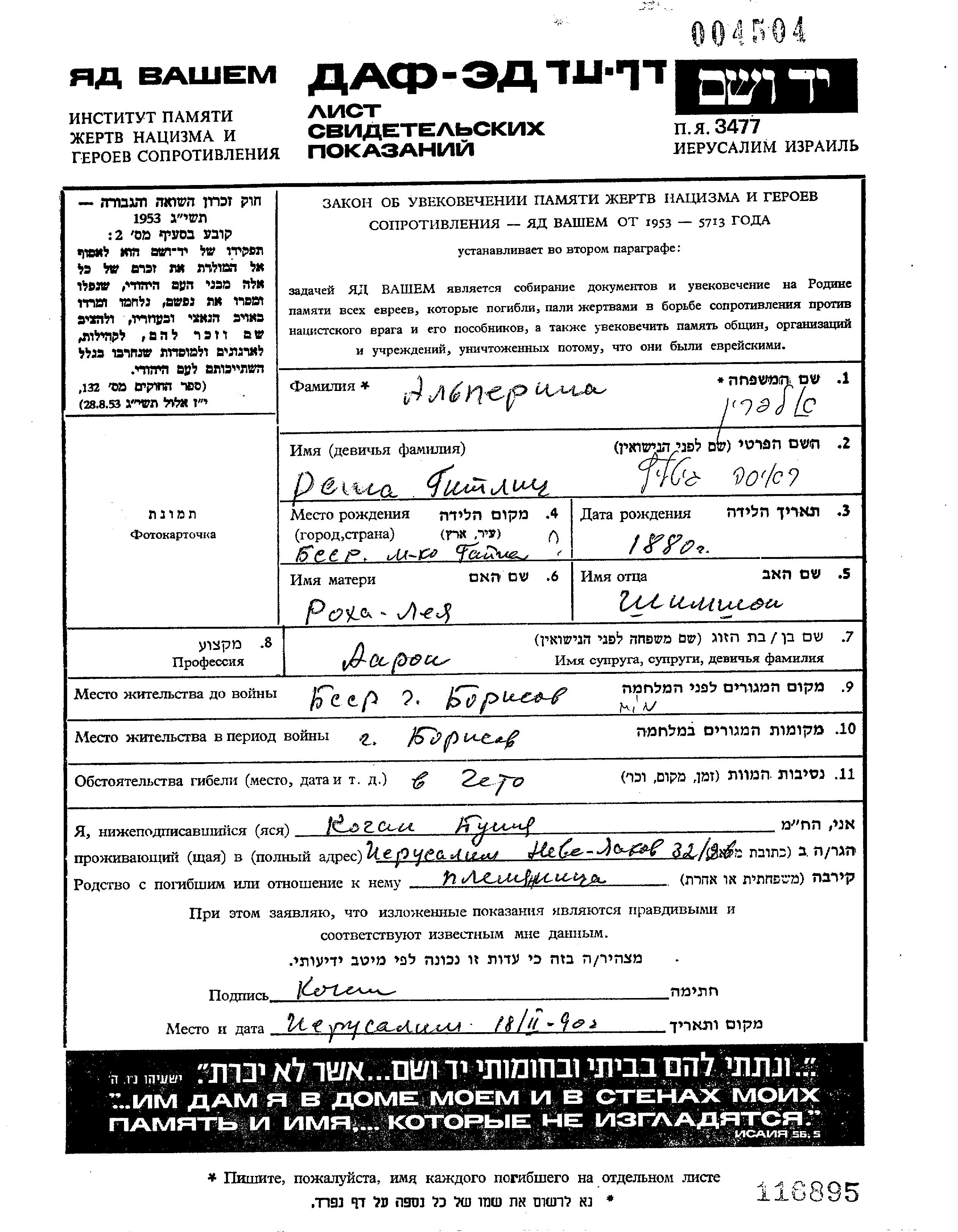 Raisa Alperin nee Gitlitz was born in Belorussia (USSR), 1880 to Shimshon and Rokha Lea. She was married to Aaron. Prior to WWII she lived in Borisov, Belorussia (USSR). During the war she was in Borisov, Belorussia (USSR). Raisa was murdered in the Shoah. Place of death: Borisov, Belorussia (USSR).