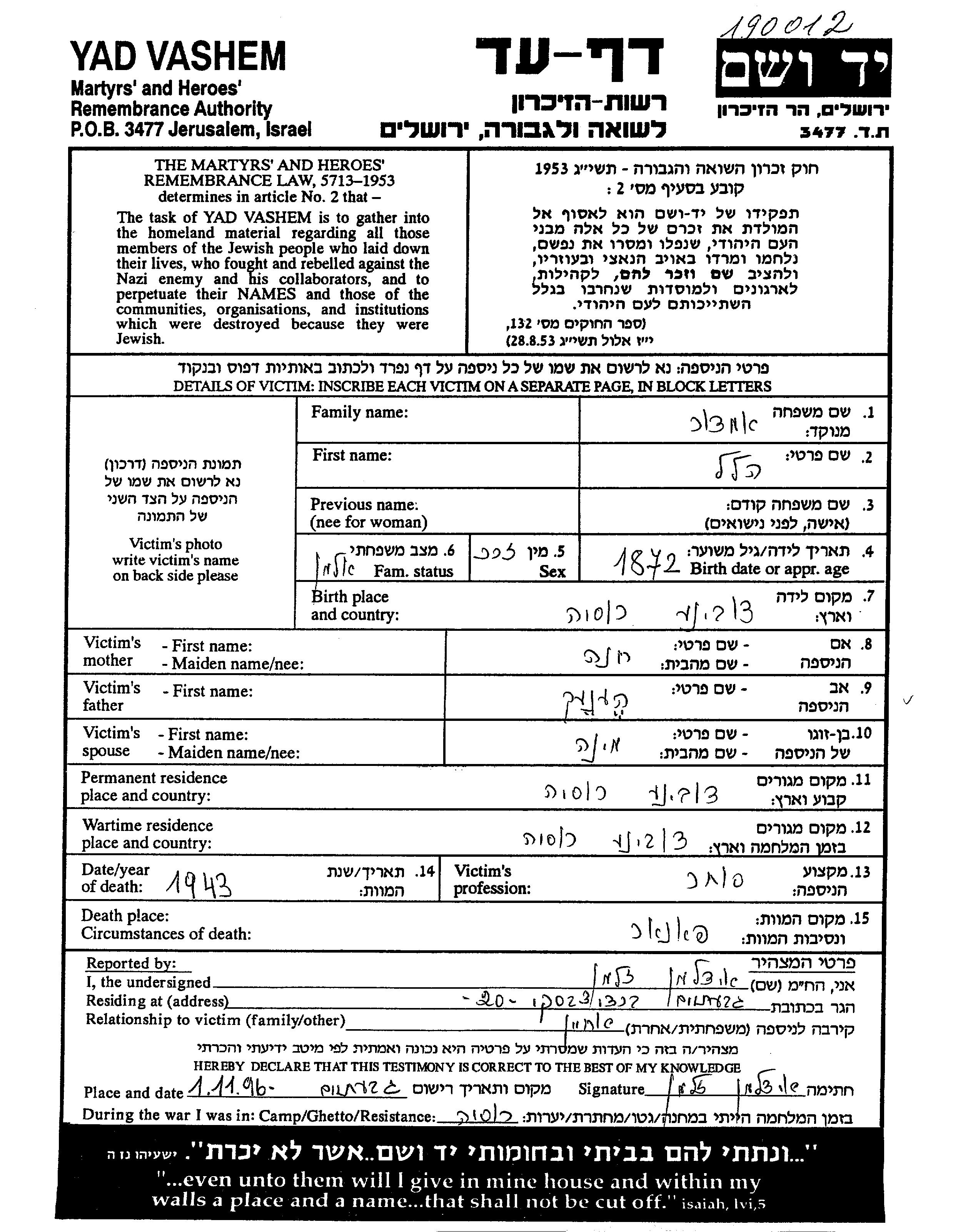 Hilel Amdur was born in Dubinowo, Poland, 1872 to Henek and Khana. He was a merchant and a widowed Mine. Prior to WWII he lived in Dubinowo, Poland. During the war he was in Dubinowo, Poland. Hilel was murdered in the Shoah. Place of death: Ponary, Poland, 1943.