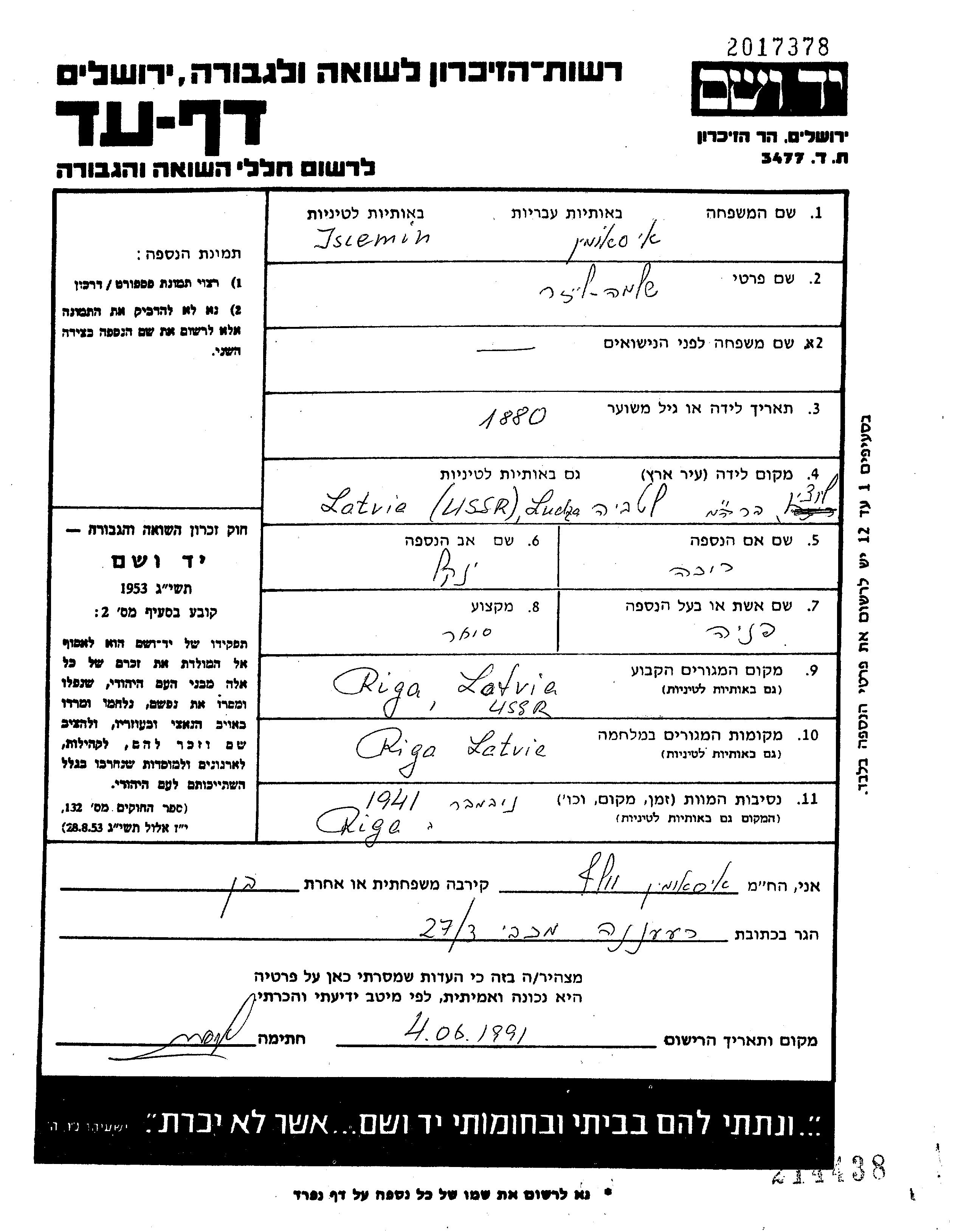 Shloma Leizer Isiemin was born in Ludza, Latvia, 1880 to Yankel and Rokha. He was a merchant and married to Fania. Prior to WWII he lived in Riga, Latvia. During the war he was in Riga, Latvia. Shloma Leizer was murdered in the Shoah. Place of death: Riga, Latvia, 1941.