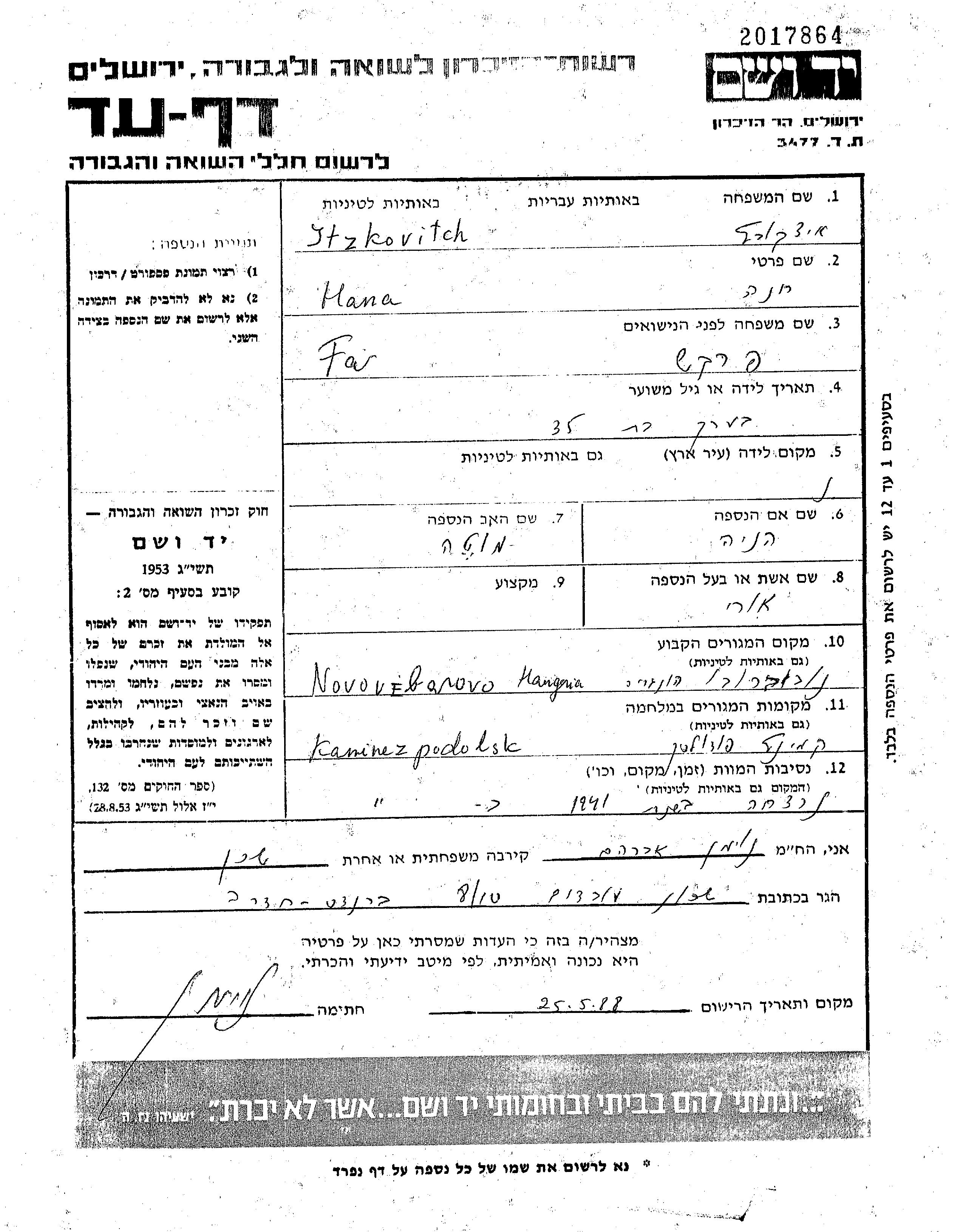 Hana Itzkovitch nee Farkash was born to Mote Mota and Henia. She was married to Uri. Prior to WWII she lived in Novoje Barijovo, Czechoslovakia. During the war she was in Kamenets Podolskiy, Ukraine (USSR).