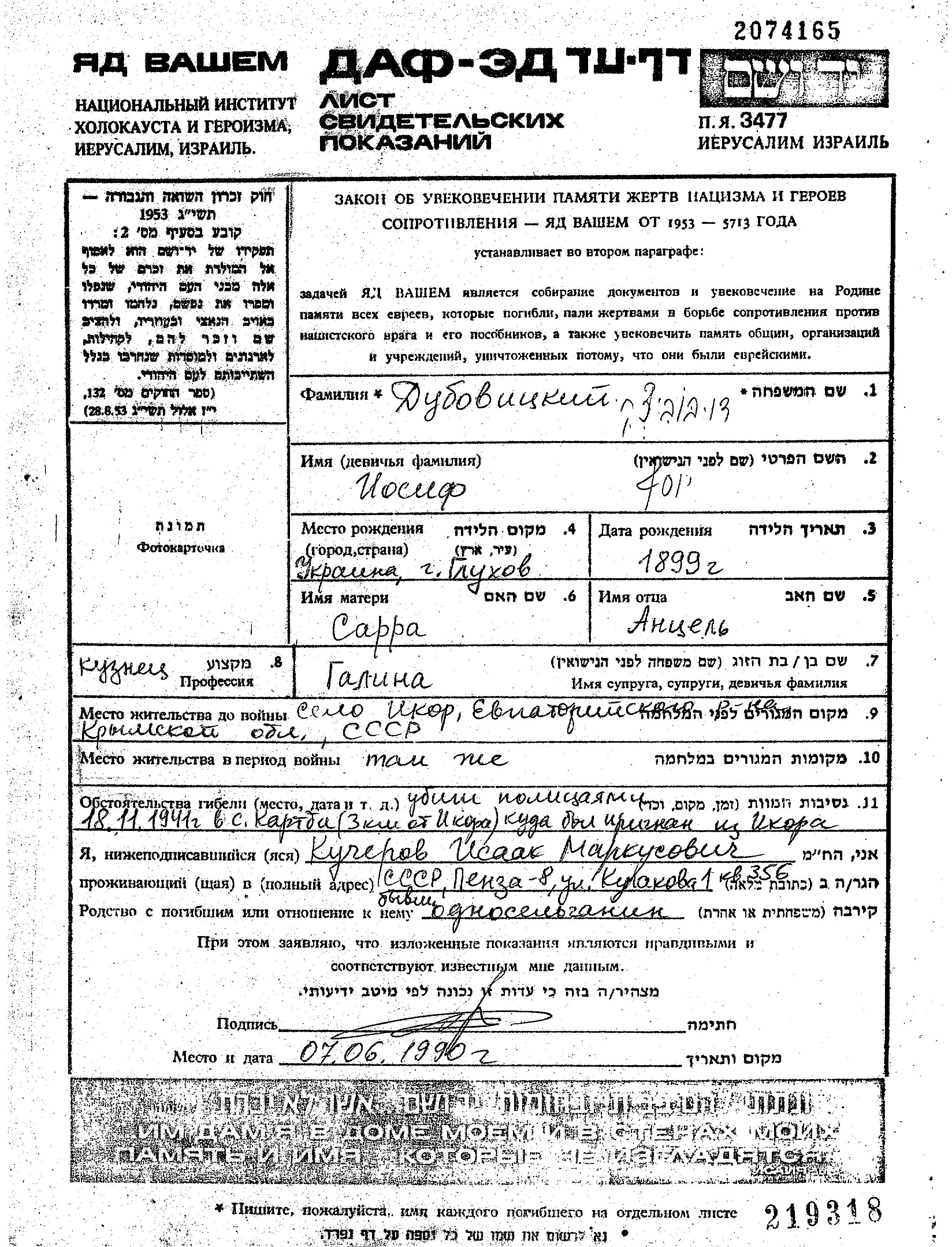 Dubovitzki Iosif 1899 Ikor, Russia (USSR) Page of Testimony