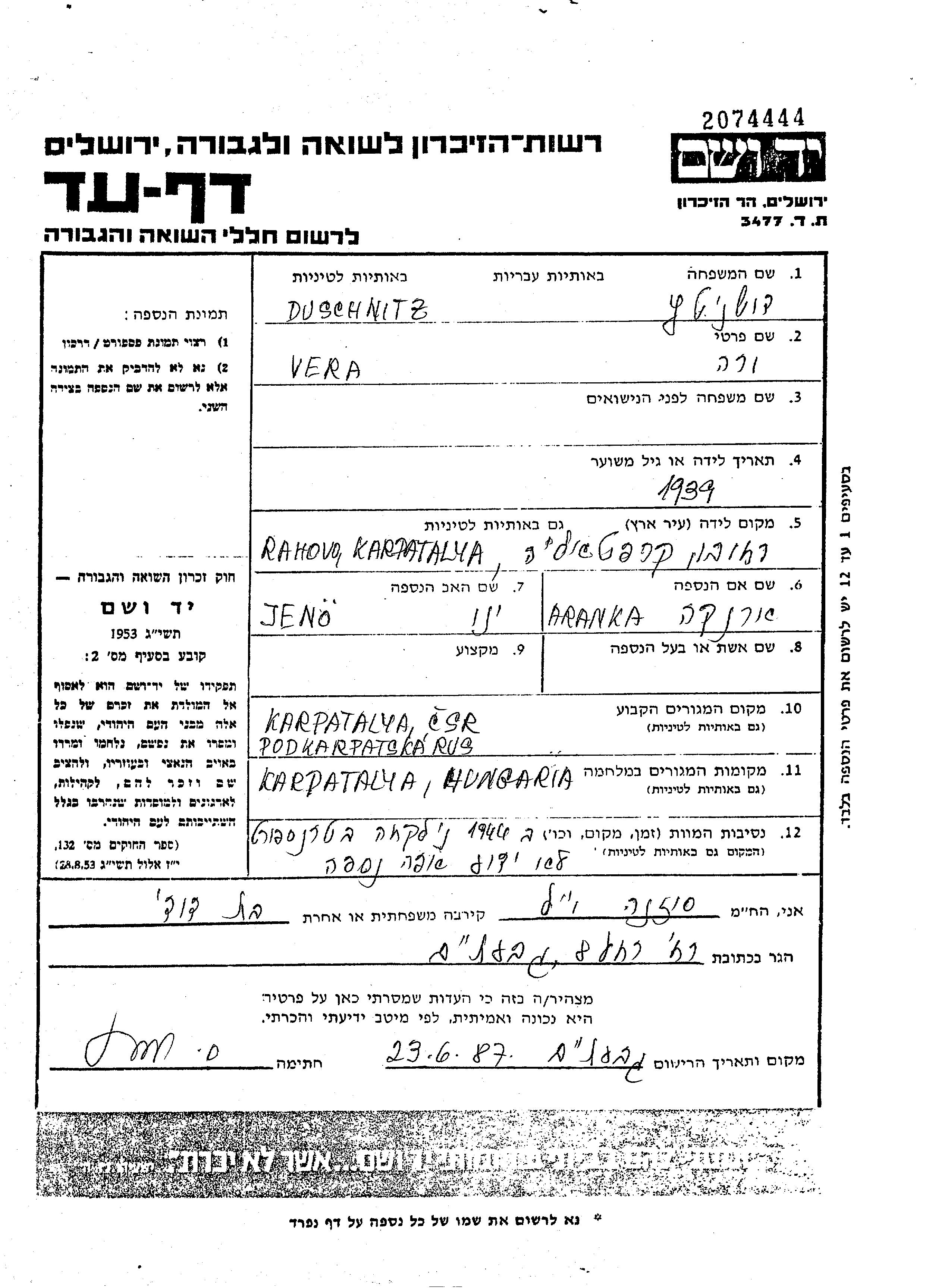 Duschnitz Vera Czechoslovakia Page of Testimony
