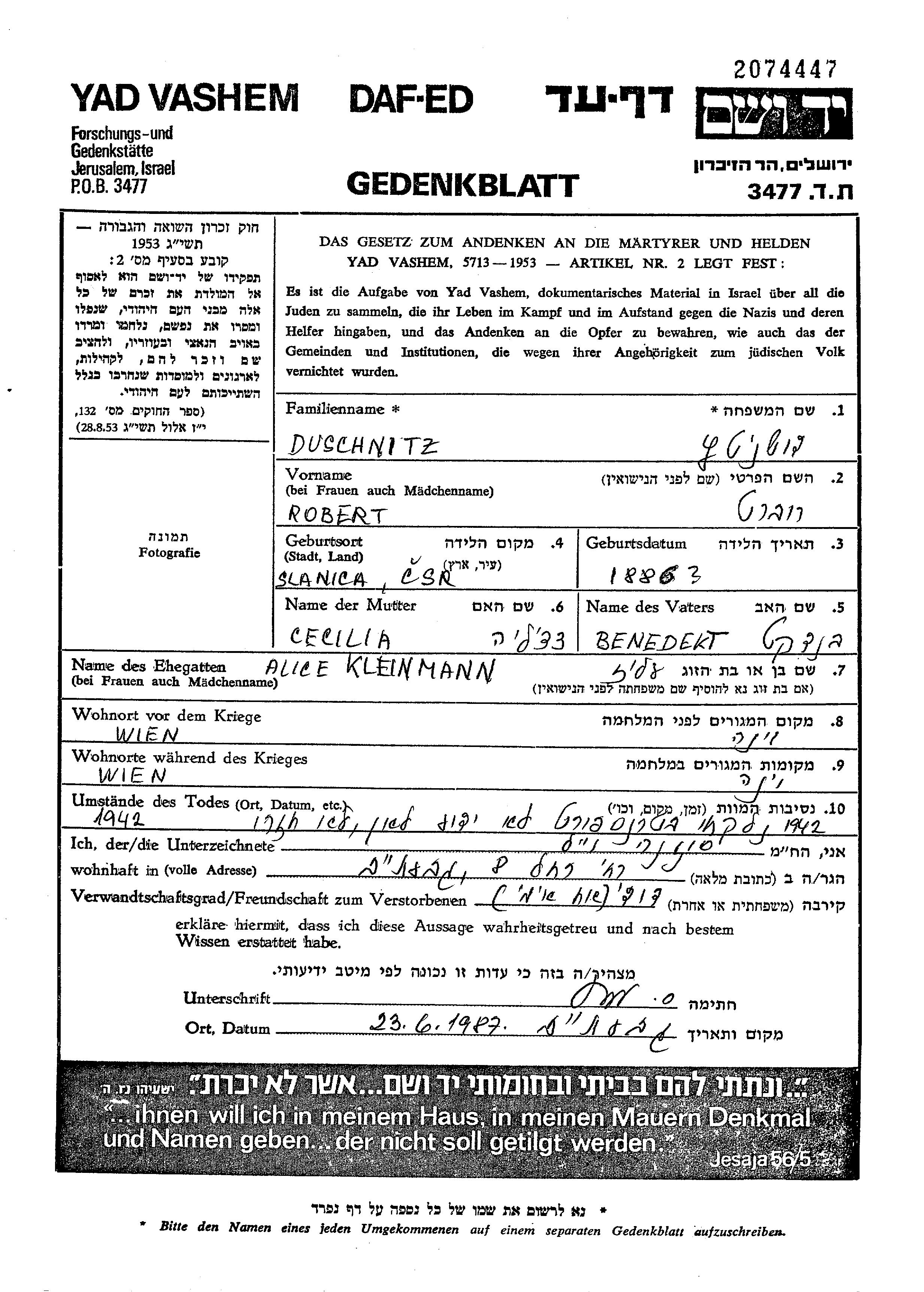Duschnitz Robert Wien, Austria Page of Testimony