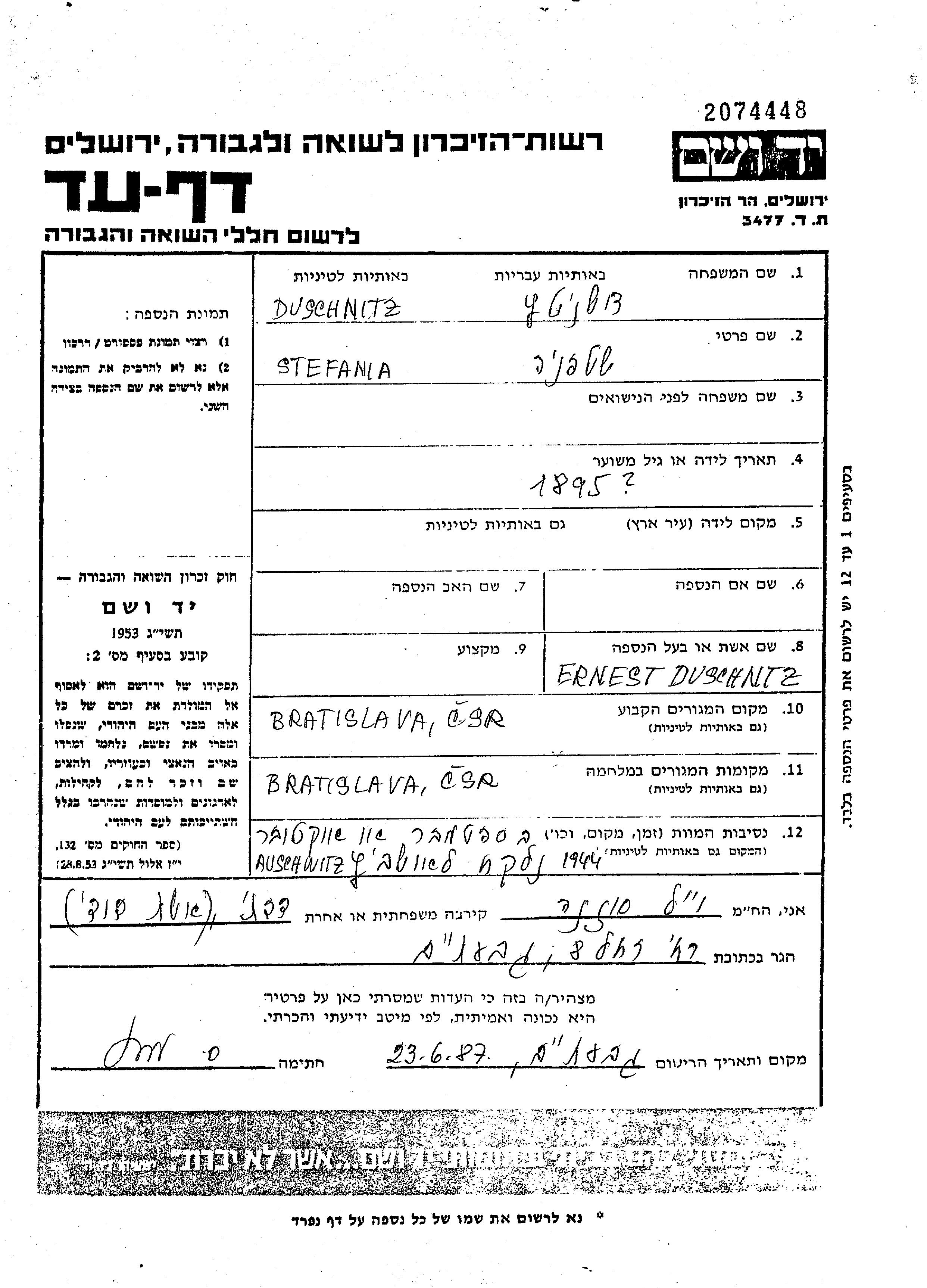 Duschnitz Shtefania Bratislava, Czechoslovakia Page of Testimony