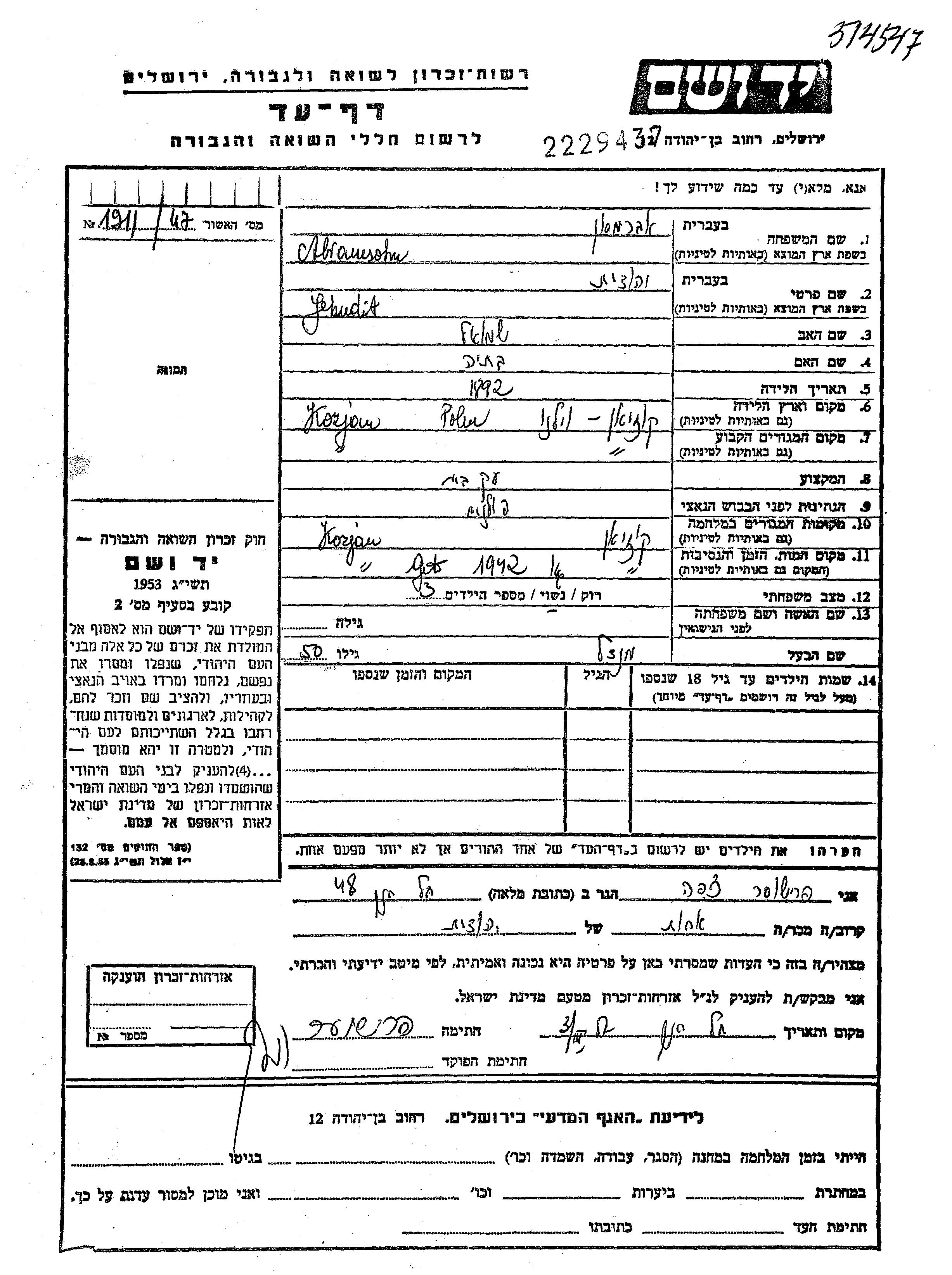 Abramson Jehudit 1892 Koziany, Poland Page of Testimony