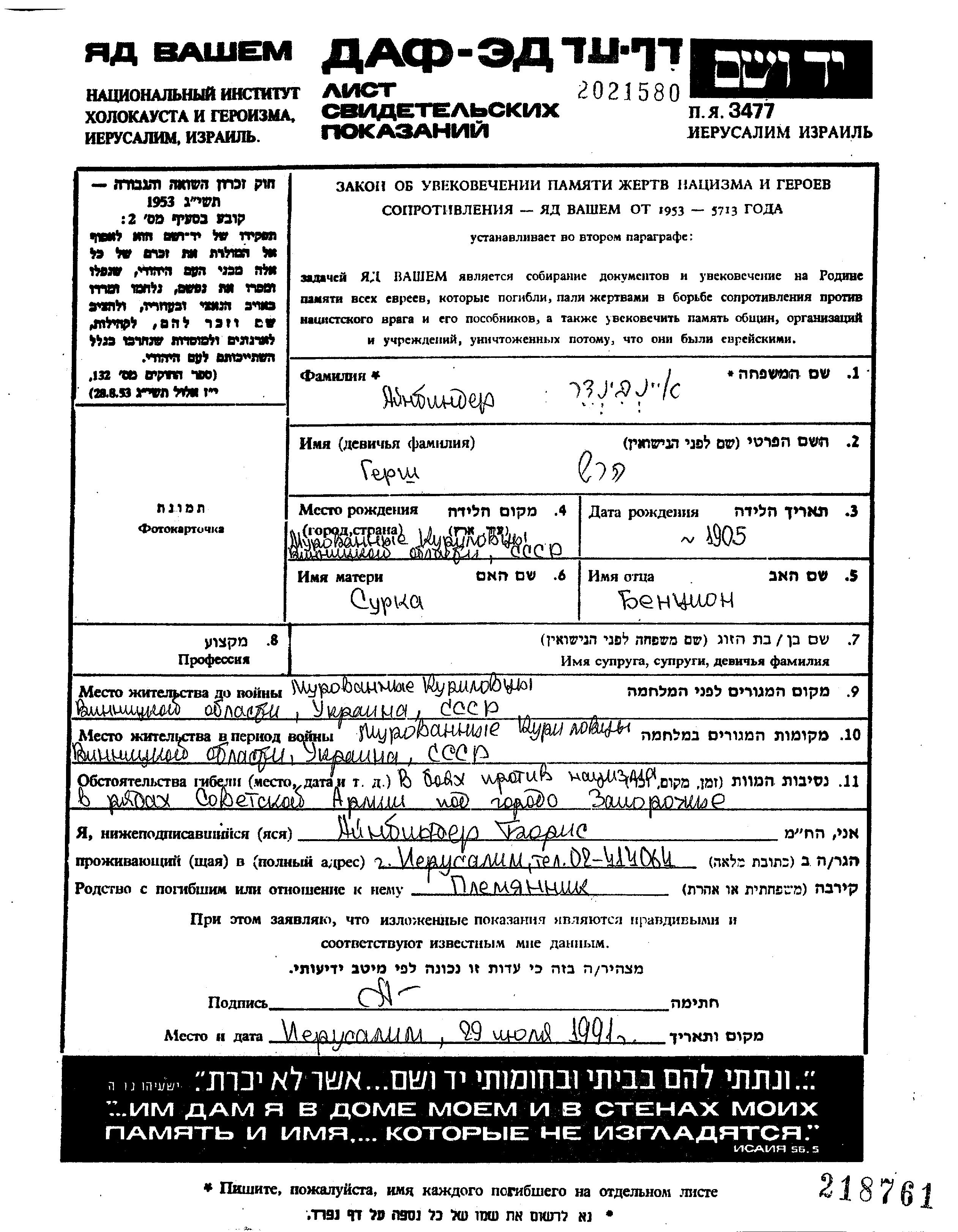 Gersh Ainbinder was born in Murovanyye Kurilovtsy, Ukraine (USSR), 1905 to Benzion and Surka. Prior to WWII he lived in Murovanyye Kurilovtsy, Ukraine (USSR). During the war he was in the Soviet armed forces. Gersh was killed in military service in WWII. Place of death: Zaporozhye, Ukraine (USSR).