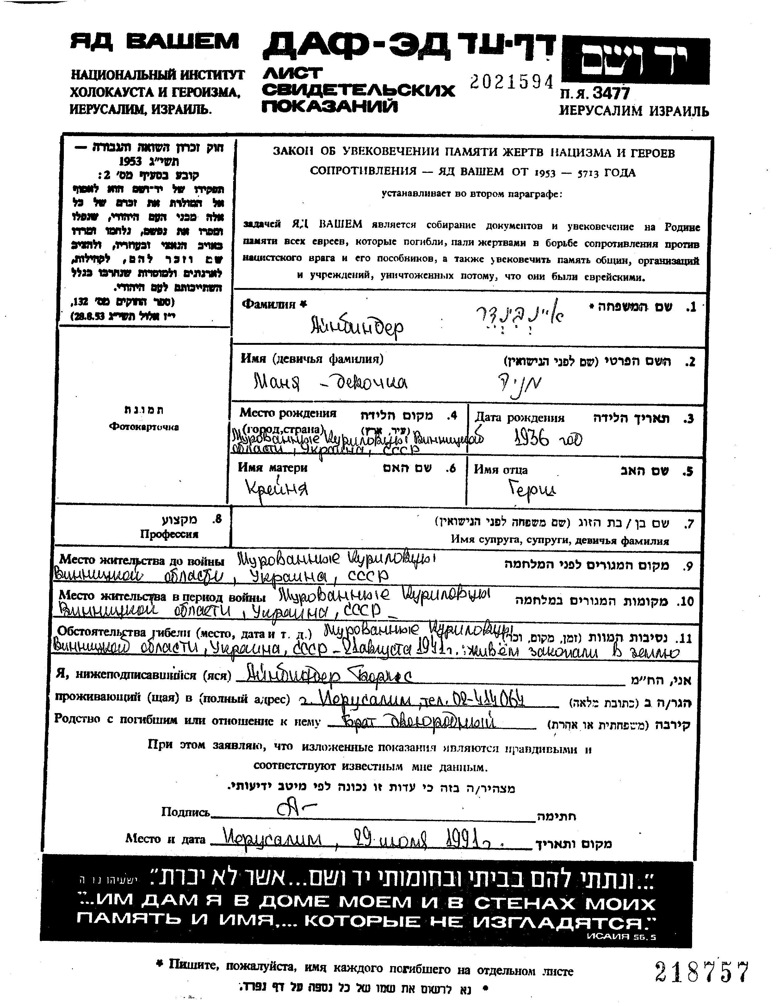 Manya Ainbinder was born in Murovanyye Kurilovtsy, Ukraine (USSR), 1936 to Gersh and Kreynya. She was child. Prior to WWII she lived in Murovanyye Kurilovtsy, Ukraine (USSR). During the war she was in Murovanyye Kurilovtsy, Ukraine (USSR). Manya was murdered in the Shoah. Place of death: Murovanyye Kurilovtsy, Ukraine (USSR), 21/08/1941.