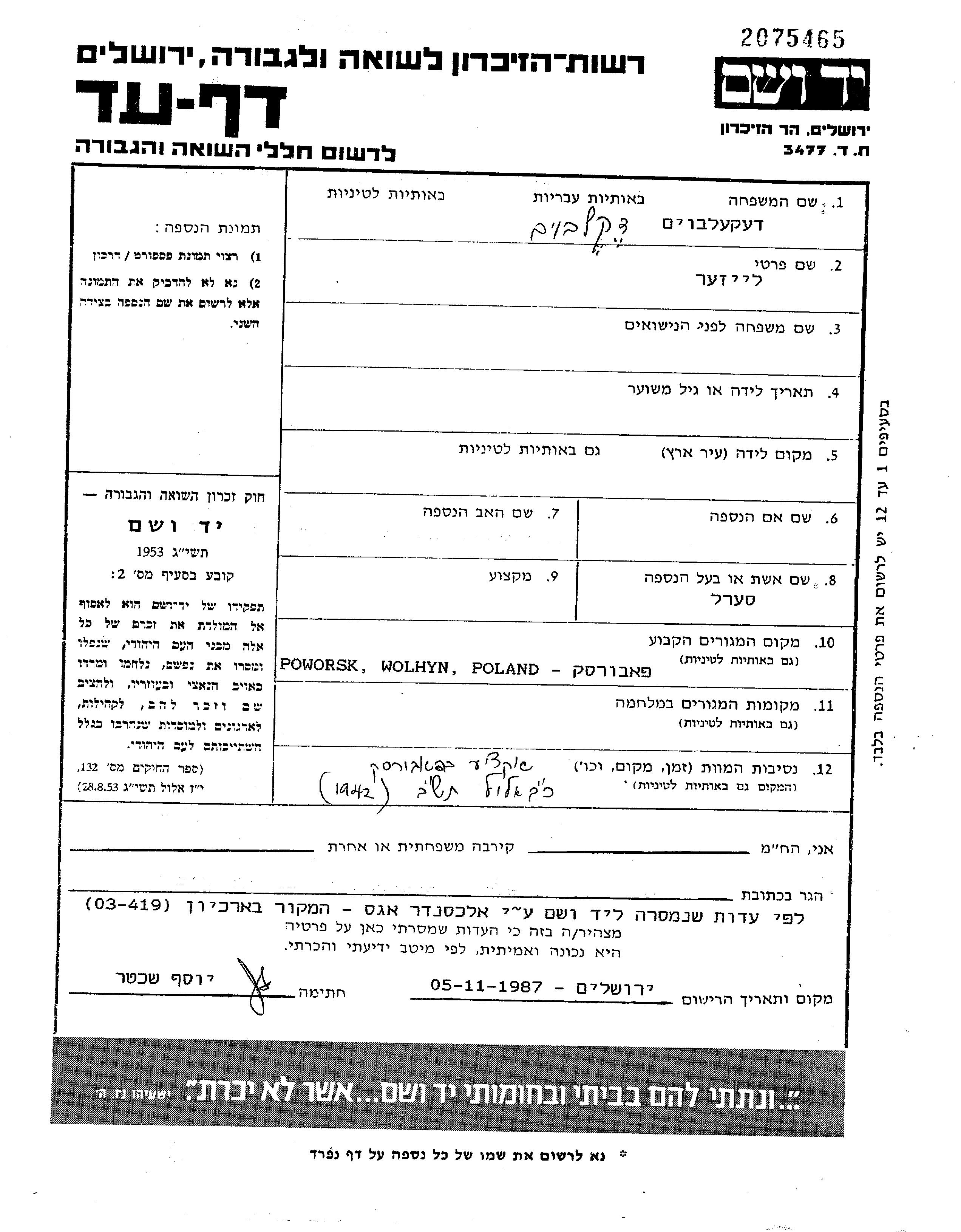 Leizer Dekelboim. He was married to Serel. Prior to WWII he lived in Poworsk, Poland. During the war he was in Poworsk, Poland. Leizer was murdered in the Shoah. Place of death: Poworsk, Poland, 04/09/1942.