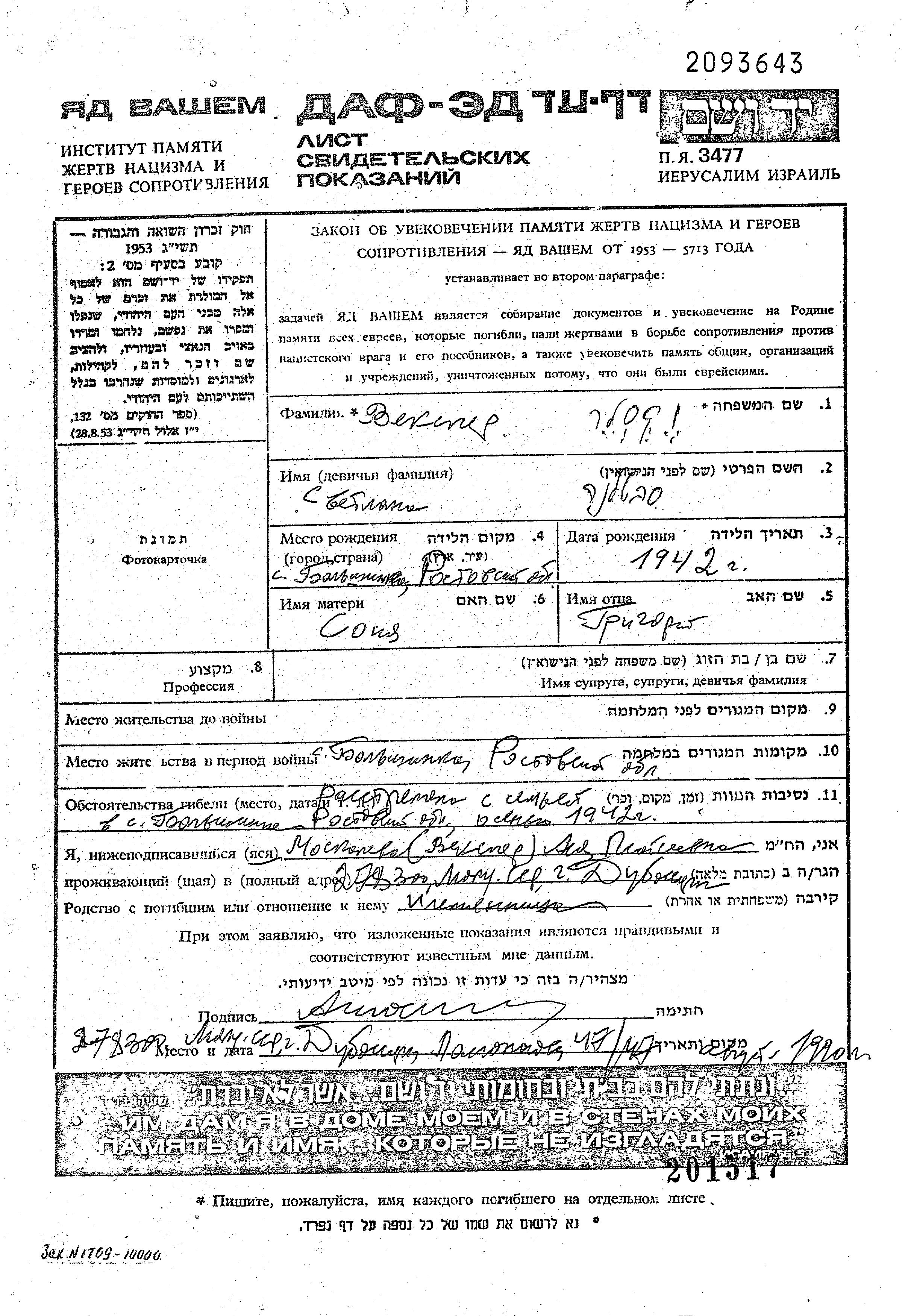 Veksler Svetlana 1942 Bolshinka, Russia (USSR) Page of Testimony