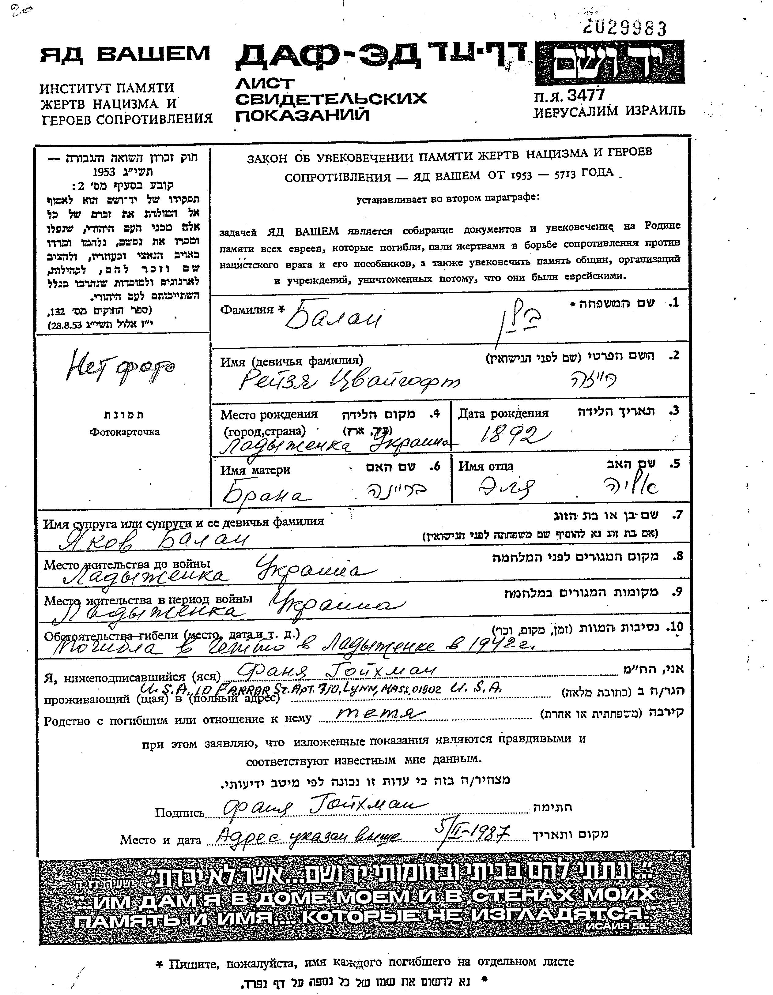 Reiza Balan Blan nee Tzvaigoft was born in Ladyzhinka, Ukraine (USSR), 1892 to Elia Alia and Braina. She was married to Yakov. Prior to WWII she lived in Ladyzhinka, Ukraine (USSR). During the war she was in Ladyzhinka, Ukraine (USSR). Reiza was murdered in the Shoah. Place of death: Ladyzhinka, Ukraine (USSR), 1942.