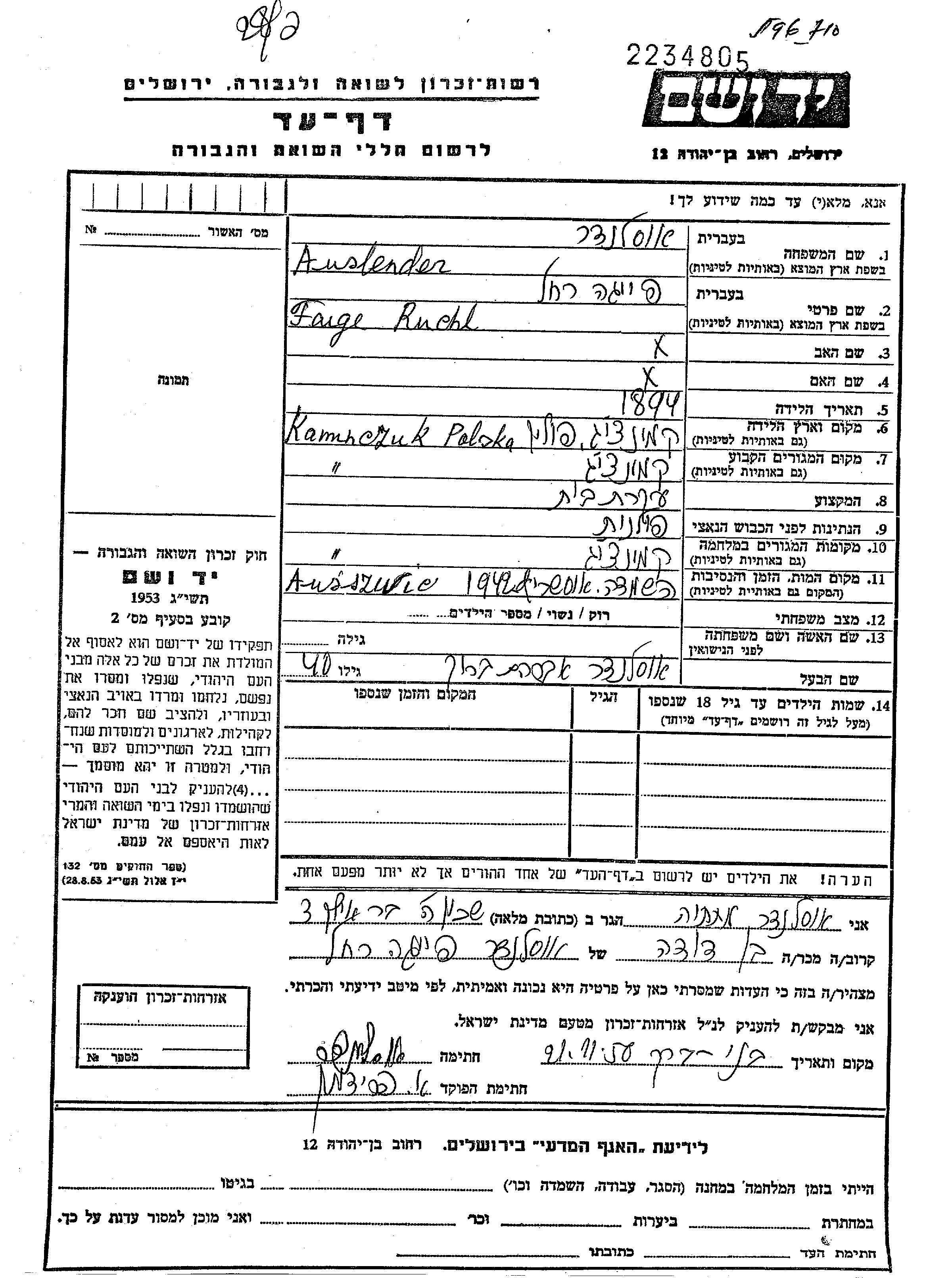 Faige Ruchl Auslender was born in Kamienczyk, Poland, 1894. She was a housewife and married to Avram Baruch. Prior to WWII she lived in Kamienczyk, Poland. During the war she was in Kamienczyk, Poland. Faige Ruchl was murdered in the Shoah. Place of death: Auschwitz, Poland, 1942.