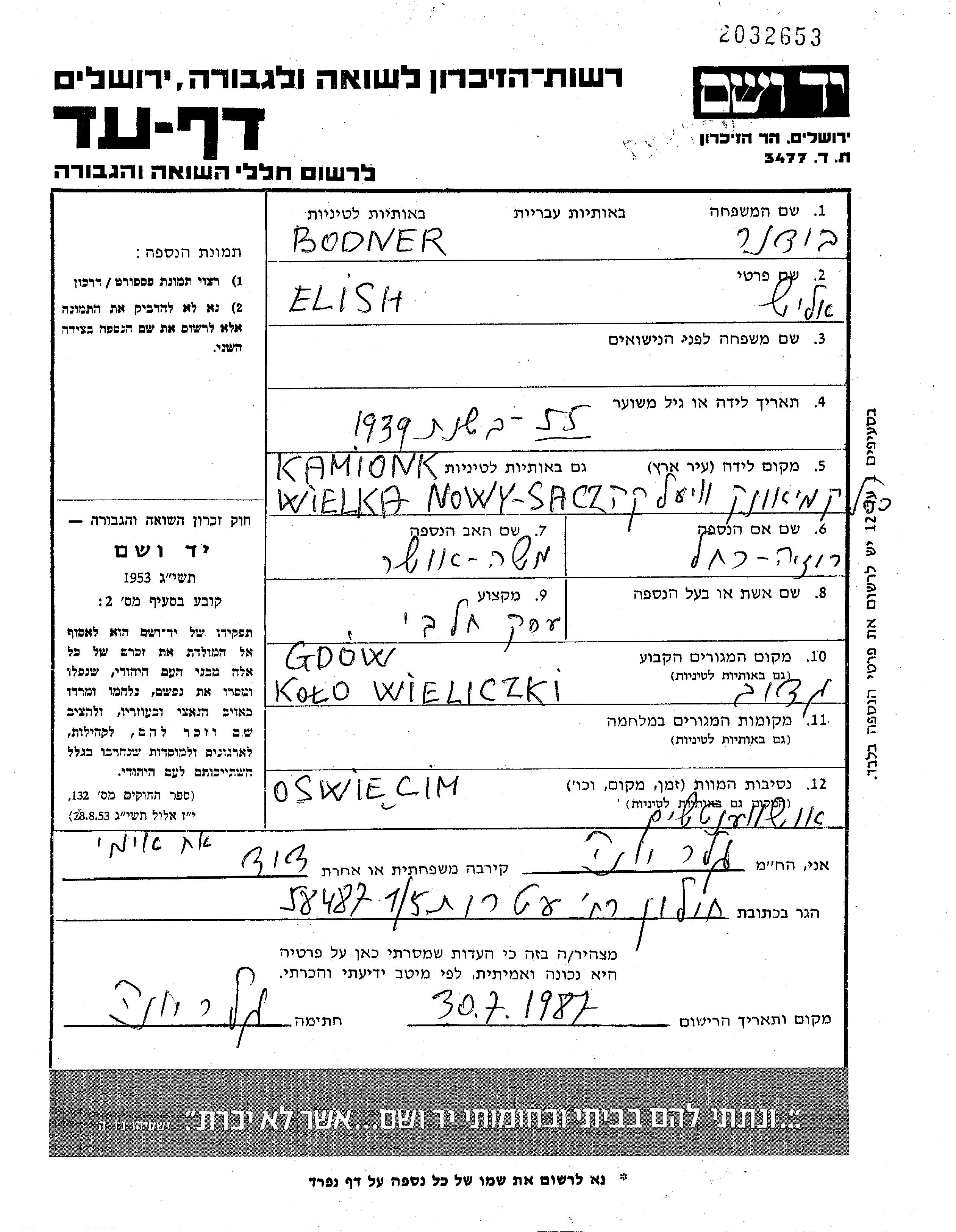 Elish Bodner was born in Kamionka Wielka, Poland to Moshe Usher and Rozia Rakhel. He was a milkman and married. Prior to WWII he lived in Gdow, Poland.