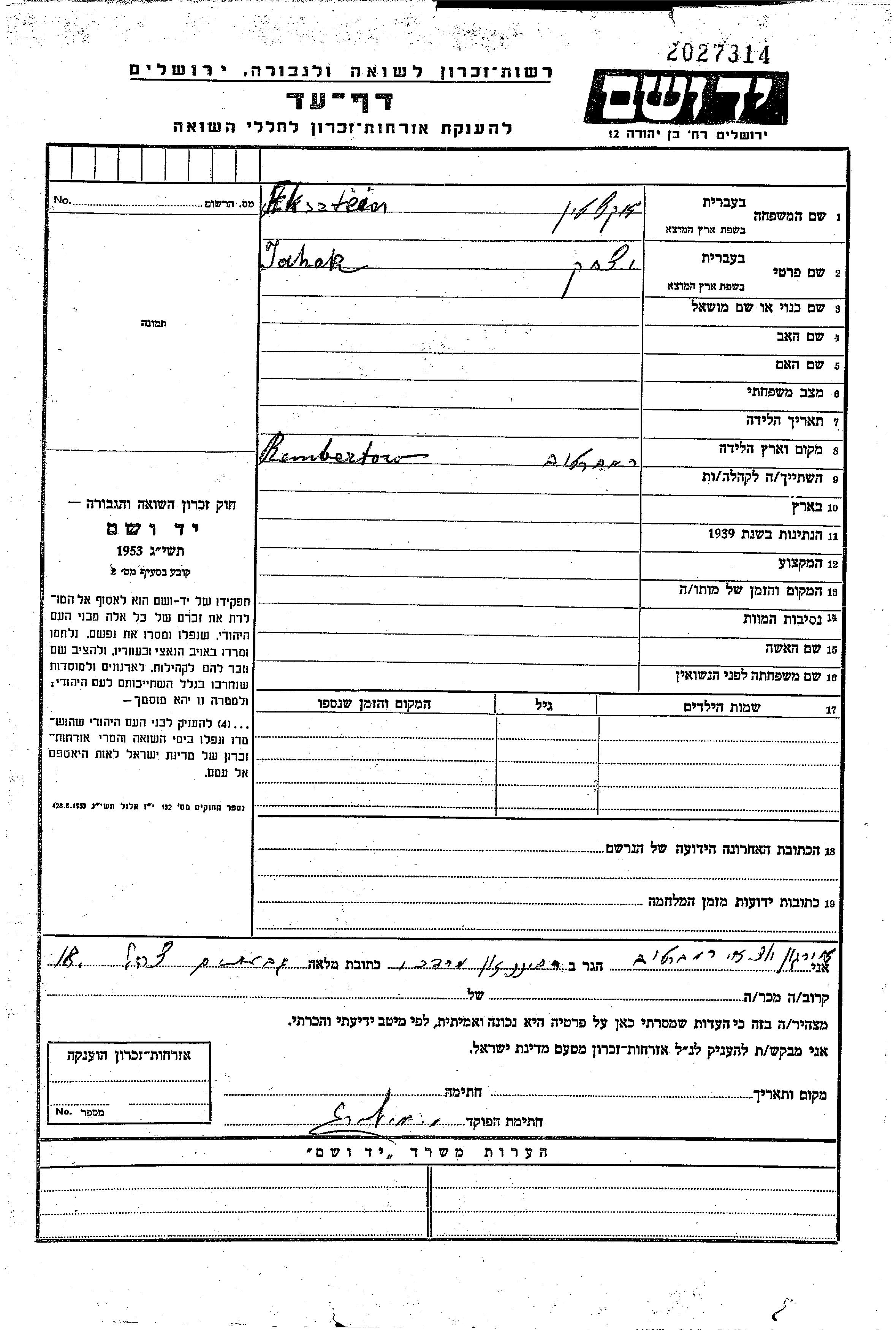 Eksztein Jchak unstated place, Page of Testimony