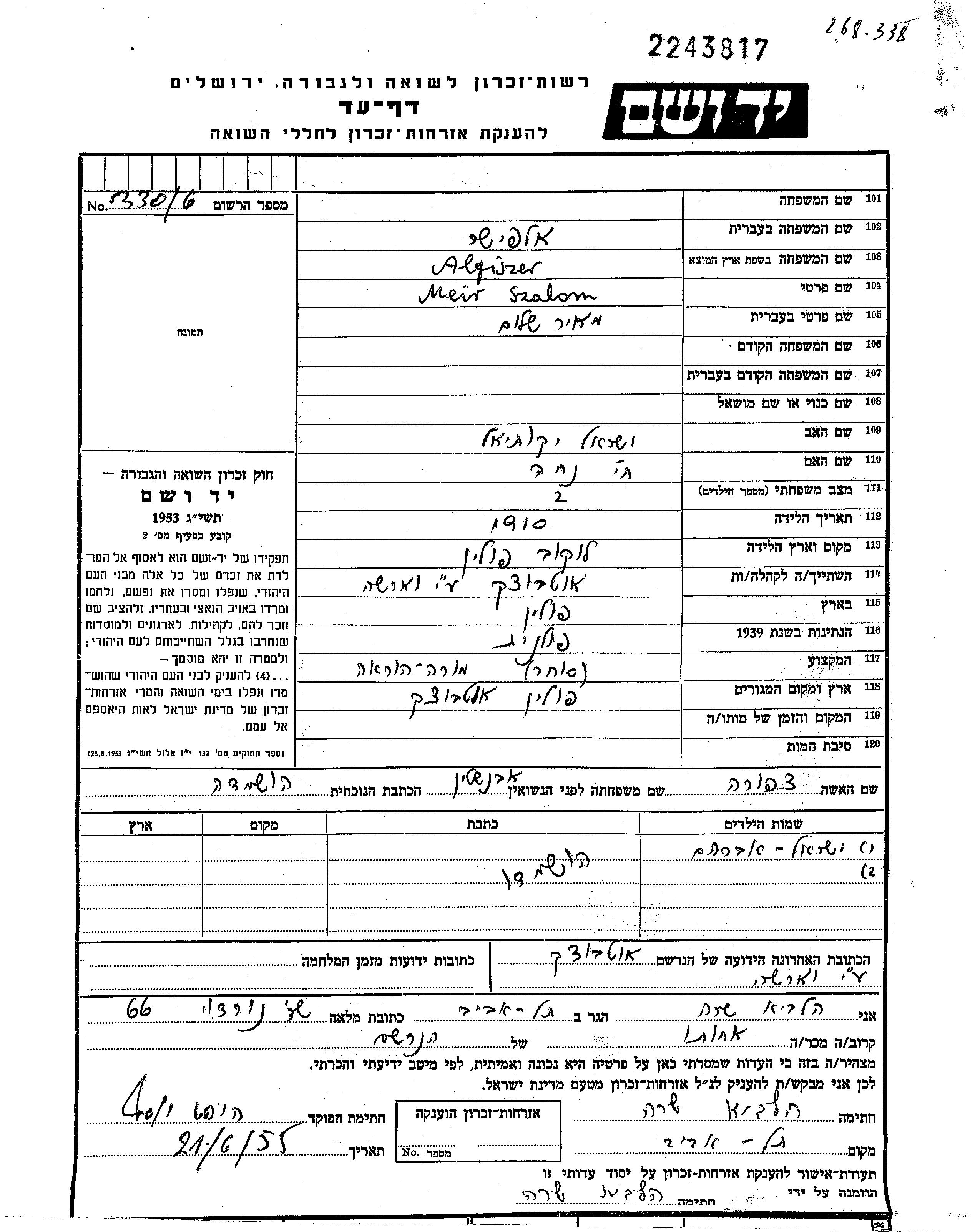 Szalom Meir Alfiszer was born in Otwock, Poland, 1910 to Israel Yekutiel and Nakha Khai. He was a teacher and married to Tzipora. Prior to WWII he lived in Lukow, Poland. During the war he was in Otwock, Poland. Szalom Meir was murdered in the Shoah. Place of death: Otwock, Poland.