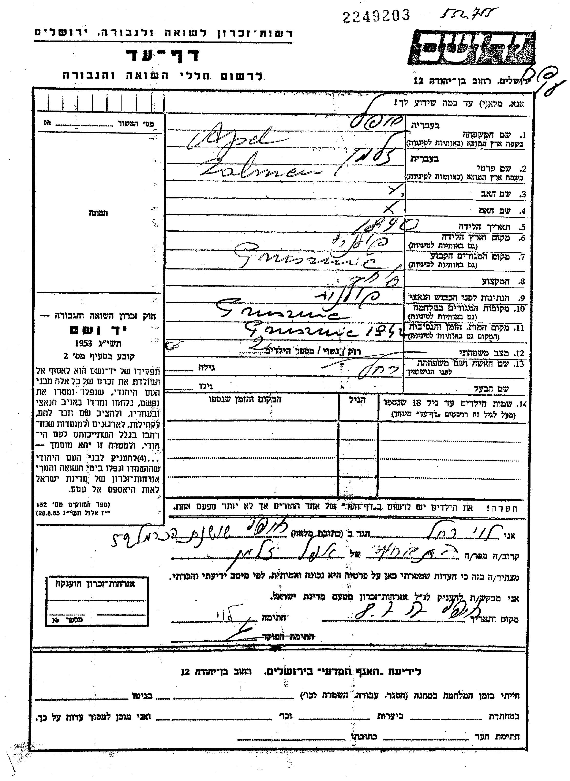 Zalmen Apel was born in Poland, 1890. He was a merchant and married to Rachel. Prior to WWII he lived in Pruzany, Poland. During the war he was in Pruzany, Poland. Zalmen was murdered in the Shoah. Place of death: Pruzany, Poland, 1942.