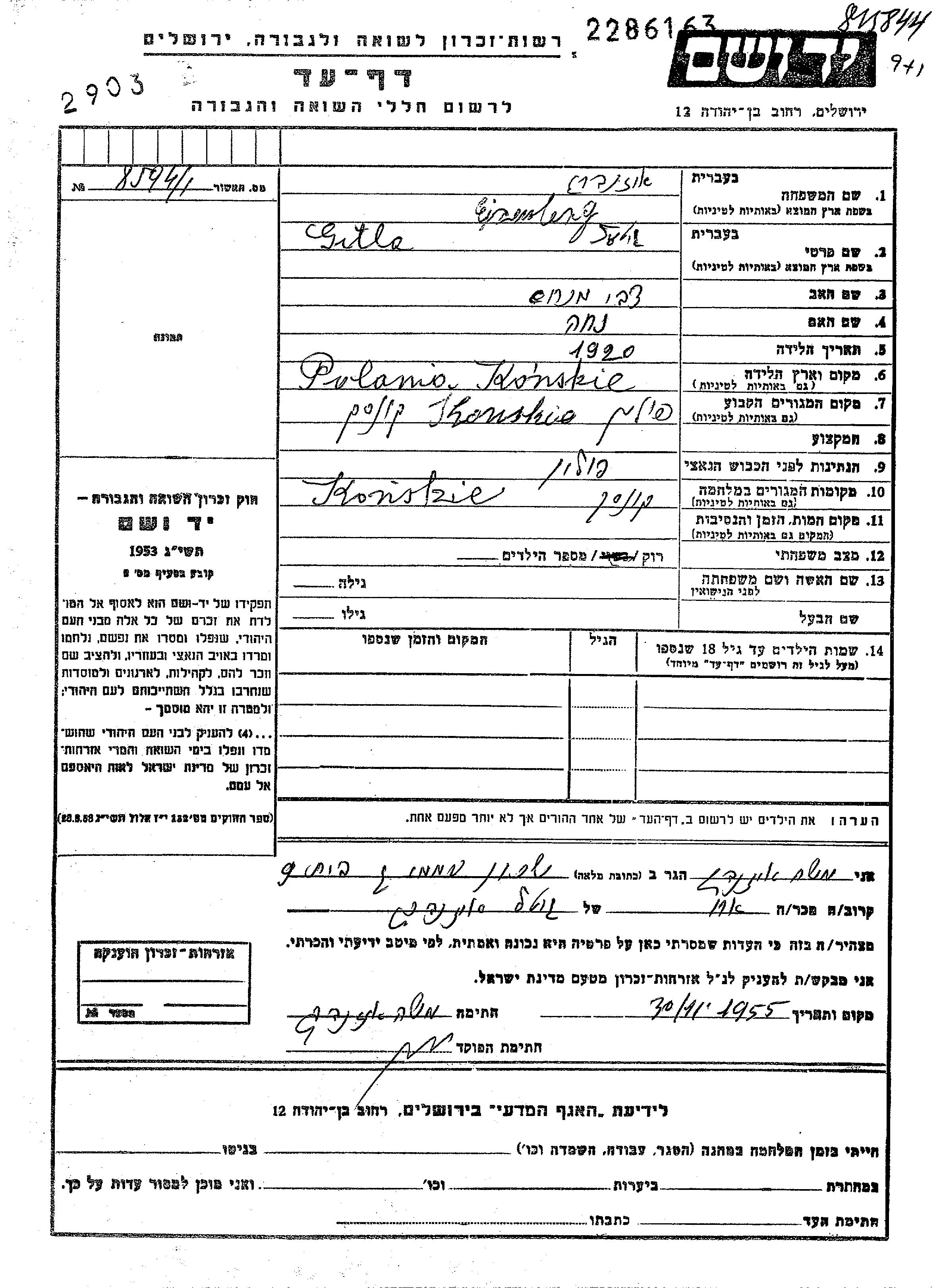 Gitl Eizenberg was born in Końskie, Poland, 1920 to Tzvi Menakhem and Nekha. She was single. Prior to WWII she lived in Końskie, Poland. During the war she was in Końskie, Poland. Gitl was murdered in the Shoah.