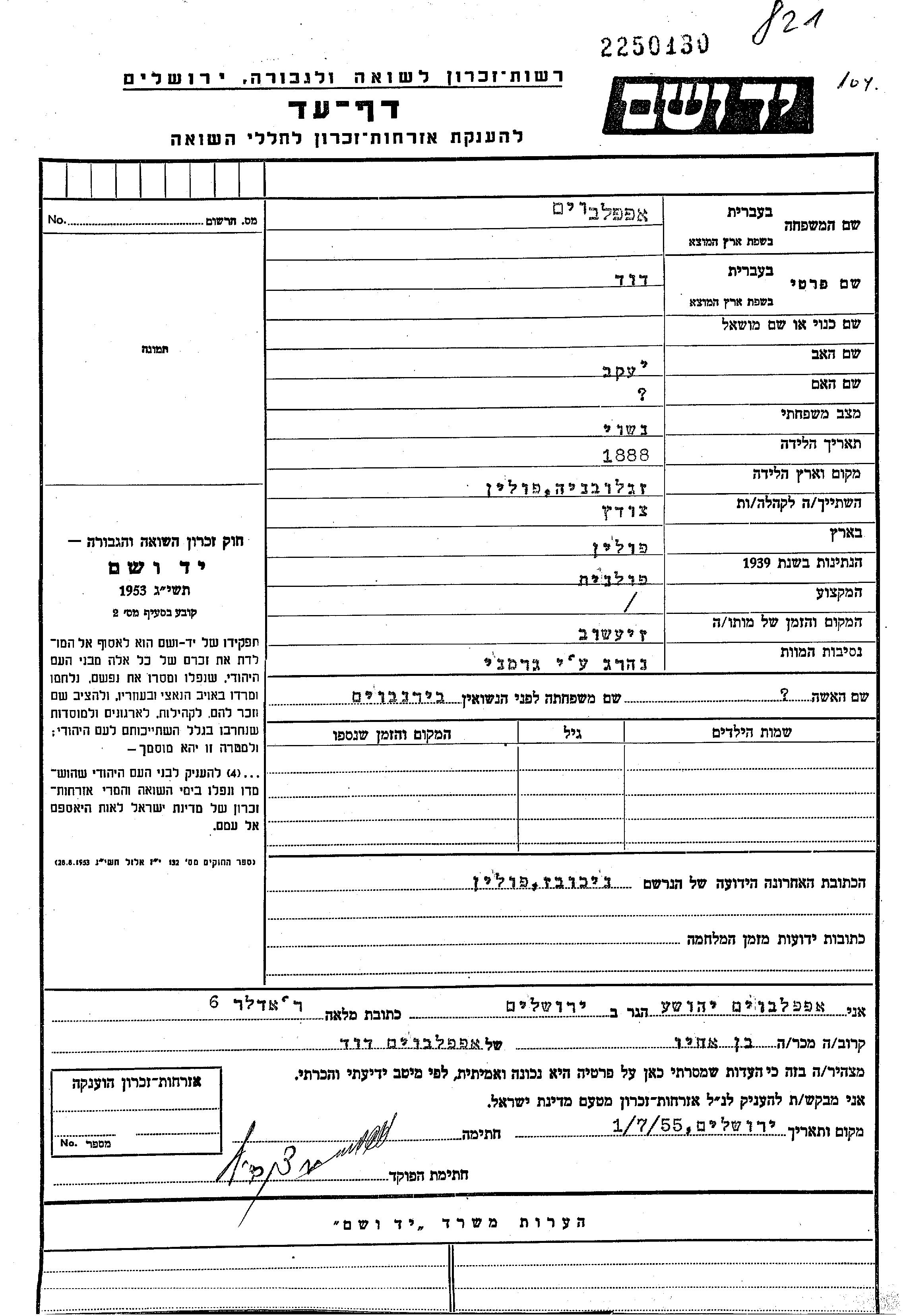 David Appelboim was born in Zglobien, Poland, 1888 to Yakov. He was married. Prior to WWII he lived in Czudec, Poland. During the war he was in Poland. David was murdered in the Shoah. Place of death: Zajaszowo, Poland.