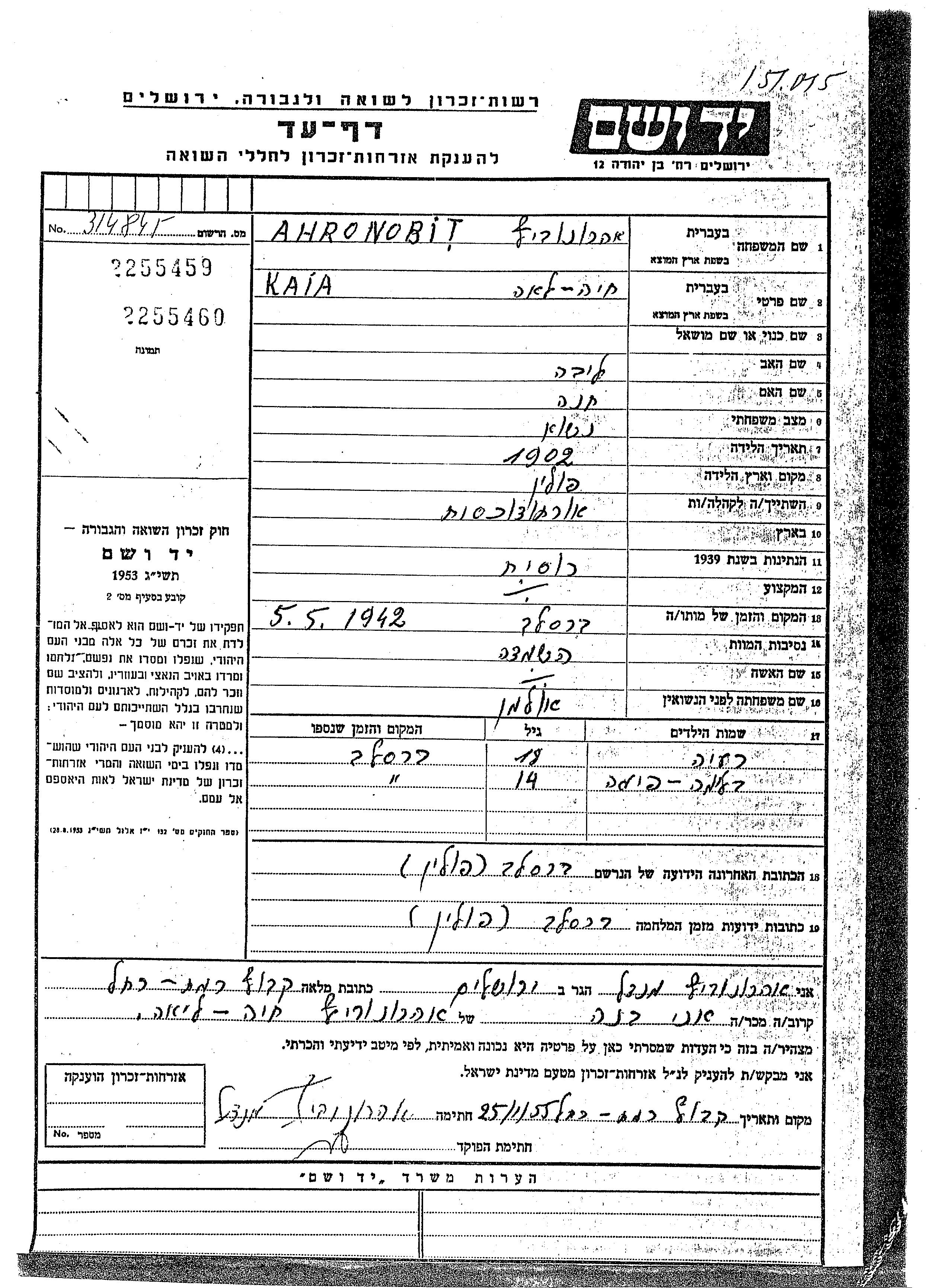Raya Ahronobit was born to Kaia Khaia Lea nee Ulman. Prior to WWII she lived in Breslav, Poland. During the war she was in Breslav, Poland.