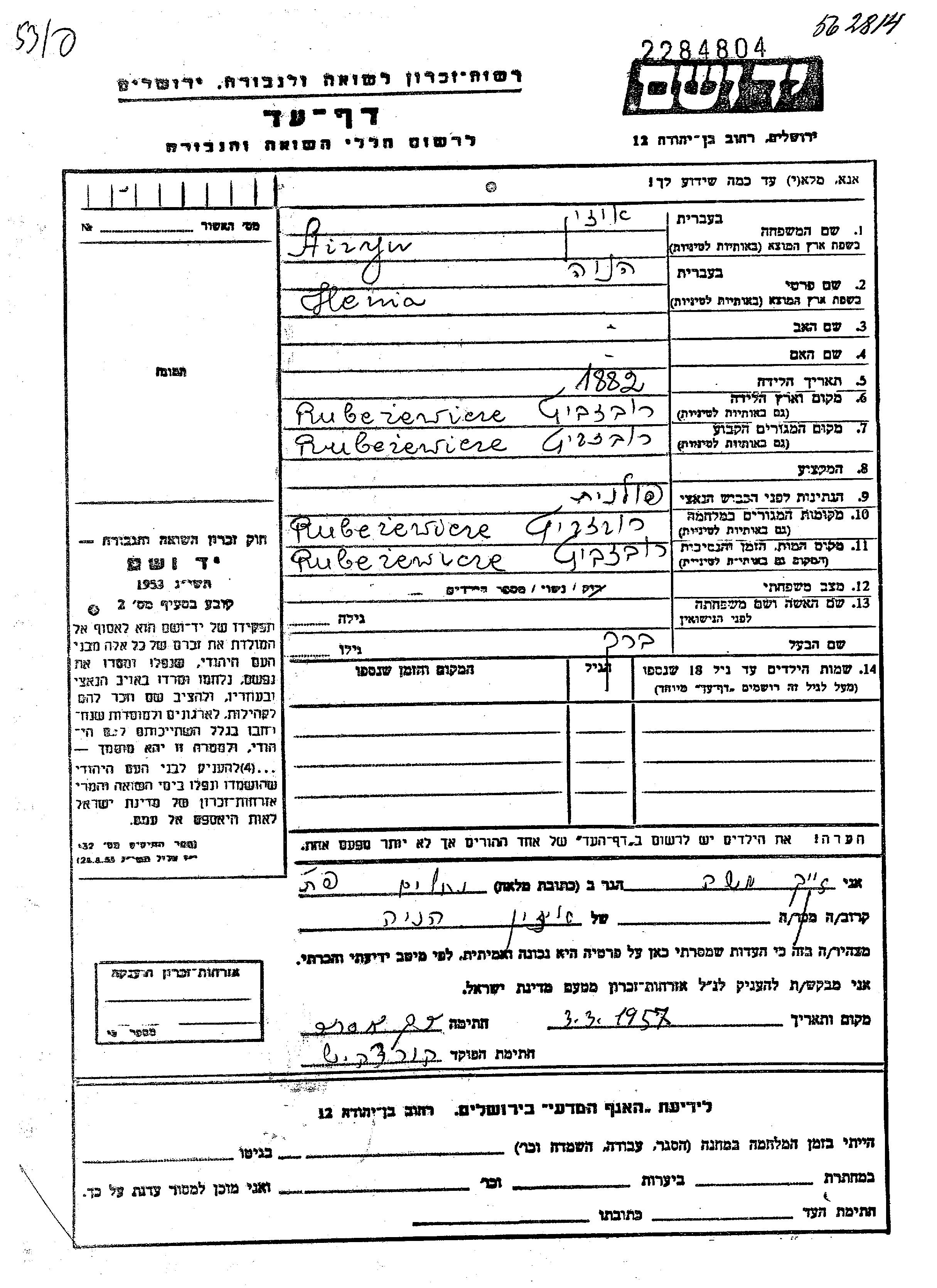 Henia Aizyn was born in Rubiezewicze, Poland, 1882. She was married to Bejrach. Prior to WWII she lived in Rubiezewicze, Poland. During the war she was in Rubiezewicze, Poland. Henia was murdered in the Shoah. Place of death: Rubiezewicze, Poland.