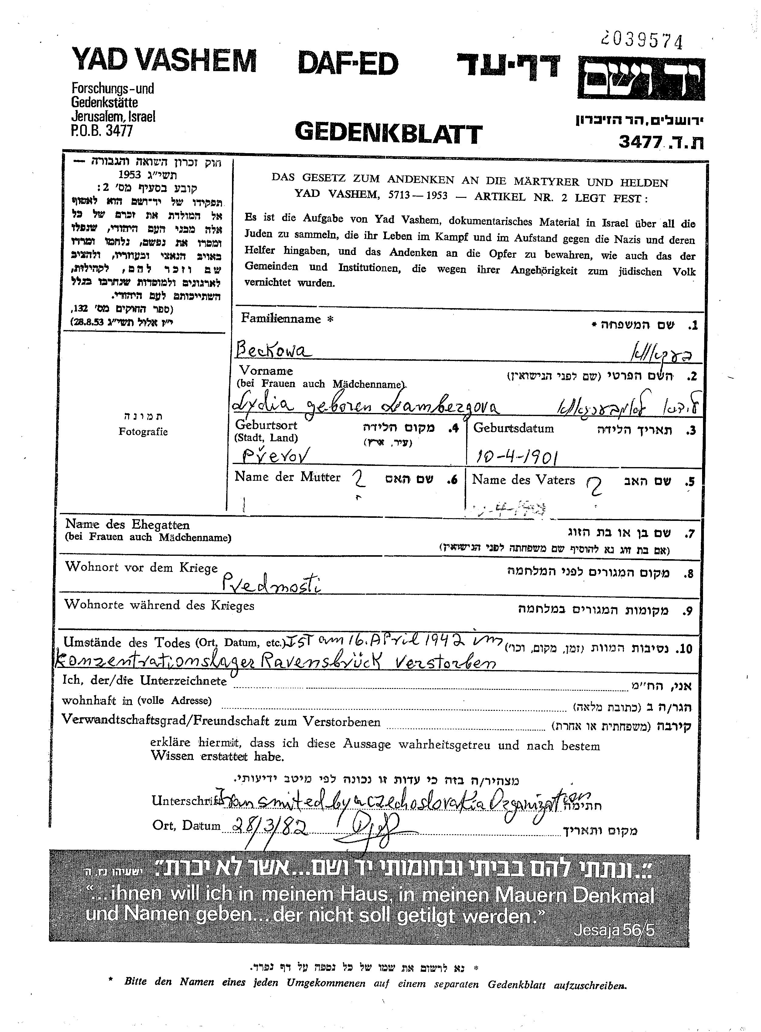Lydia Beckova nee Lambergova was born in Prerov, Czechoslovakia, 1901. Prior to WWII she lived in Predmosti, Czechoslovakia. Lydia was murdered in the Shoah. Place of death: Ravensbrück, Germany, 16/04/1942.