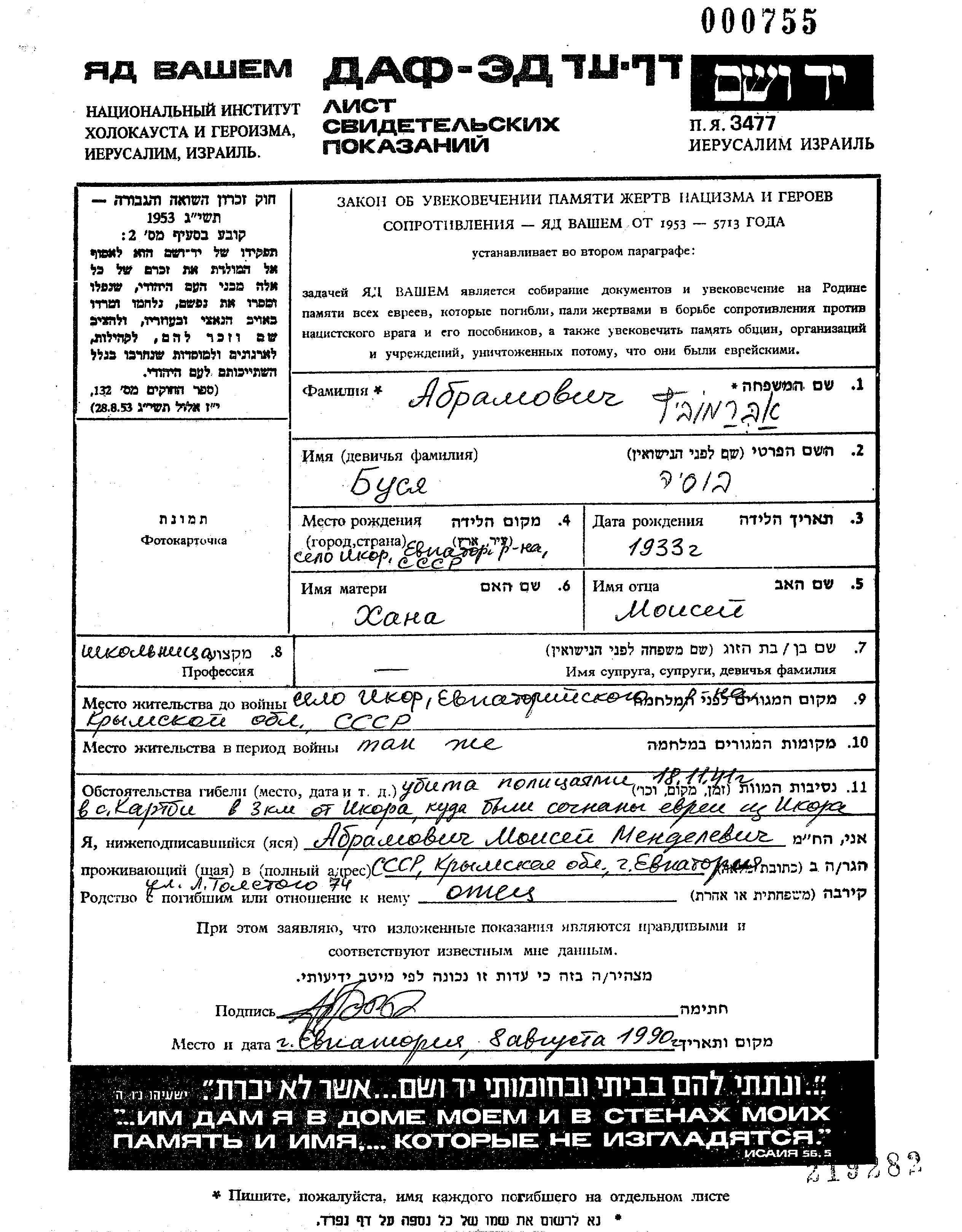 Abramovich Busia 1933 Ikor, Russia (USSR) Page of Testimony