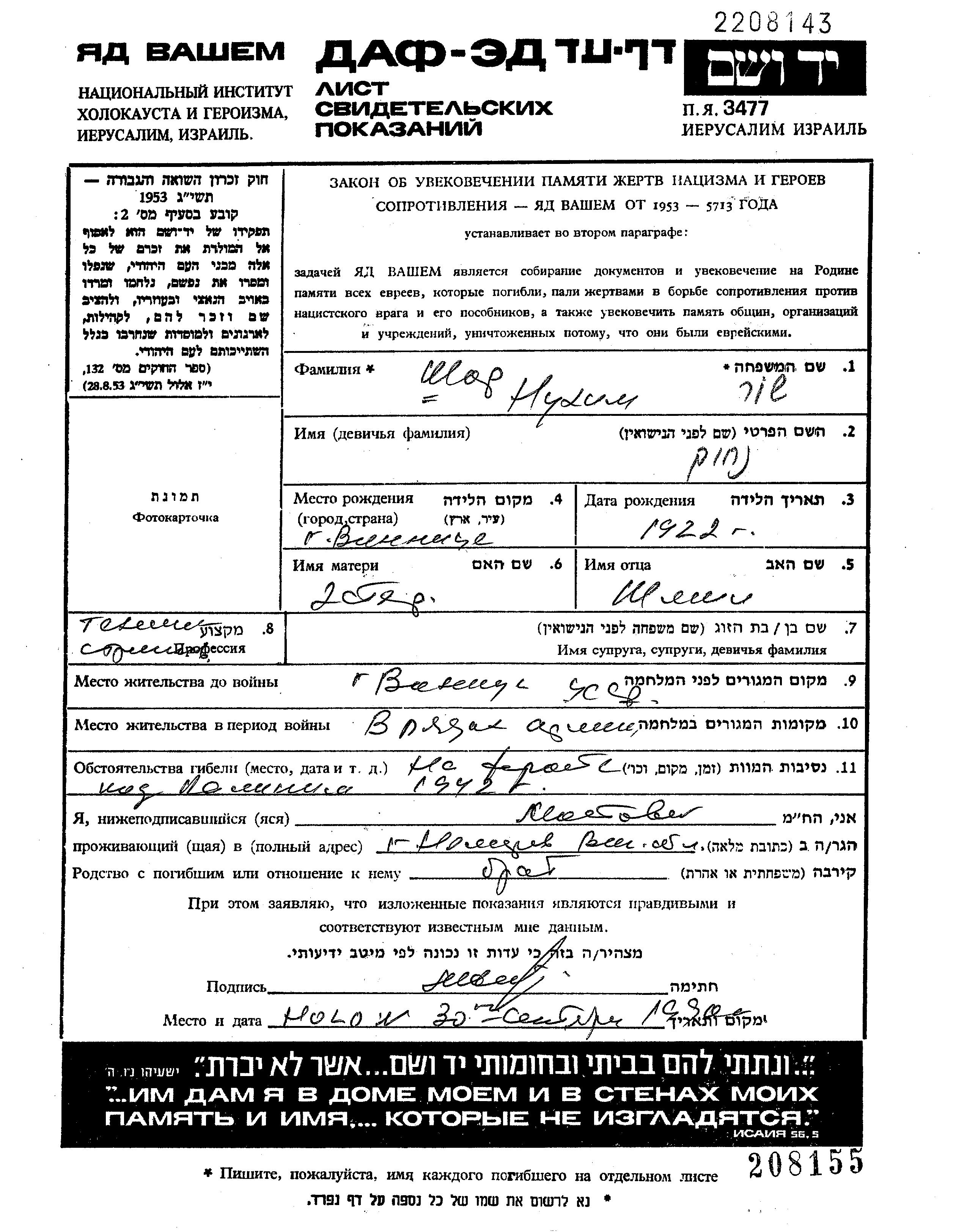 Nukhim Shor was born in Vinnitsa, Ukraine (USSR) to Shmil and Ester. He was a builder and single. Prior to WWII he lived in Vinnitsa, Ukraine (USSR). During the war he was in the Soviet armed forces. Nukhim was killed in military service in WWII. Place of death: Kalinin, Russia (USSR).