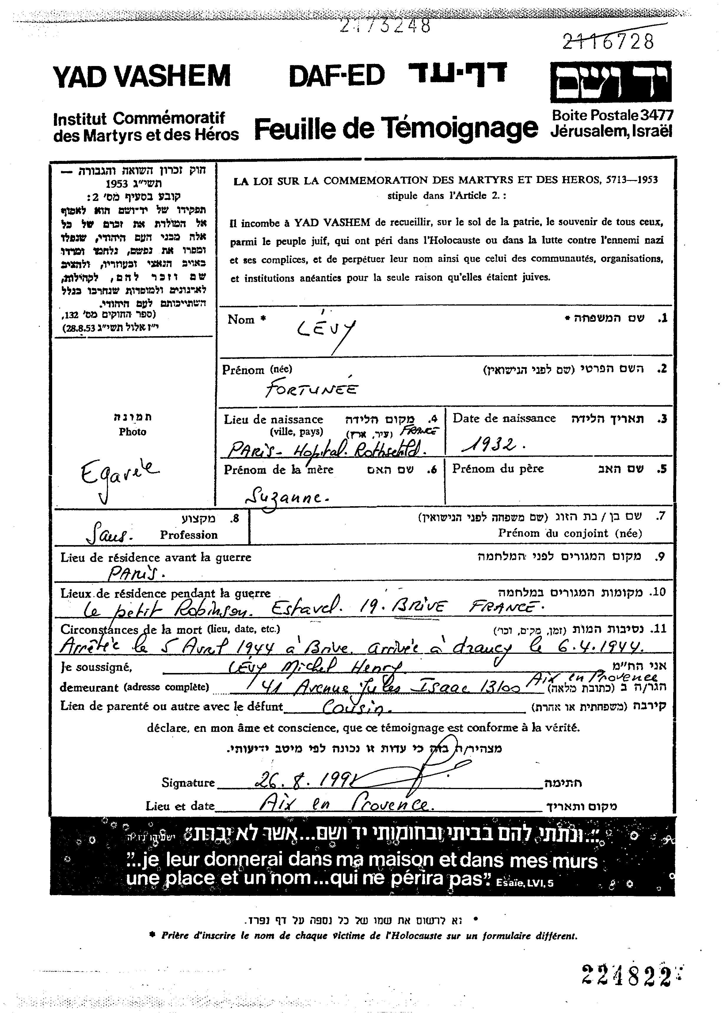 Fortuna Levy was born in Paris, France, 1932 to Suzanne. She was child. Prior to WWII she lived in Paris, France. During the war she was in Brive la Gaillarde, France. Fortuna was murdered in the Shoah.