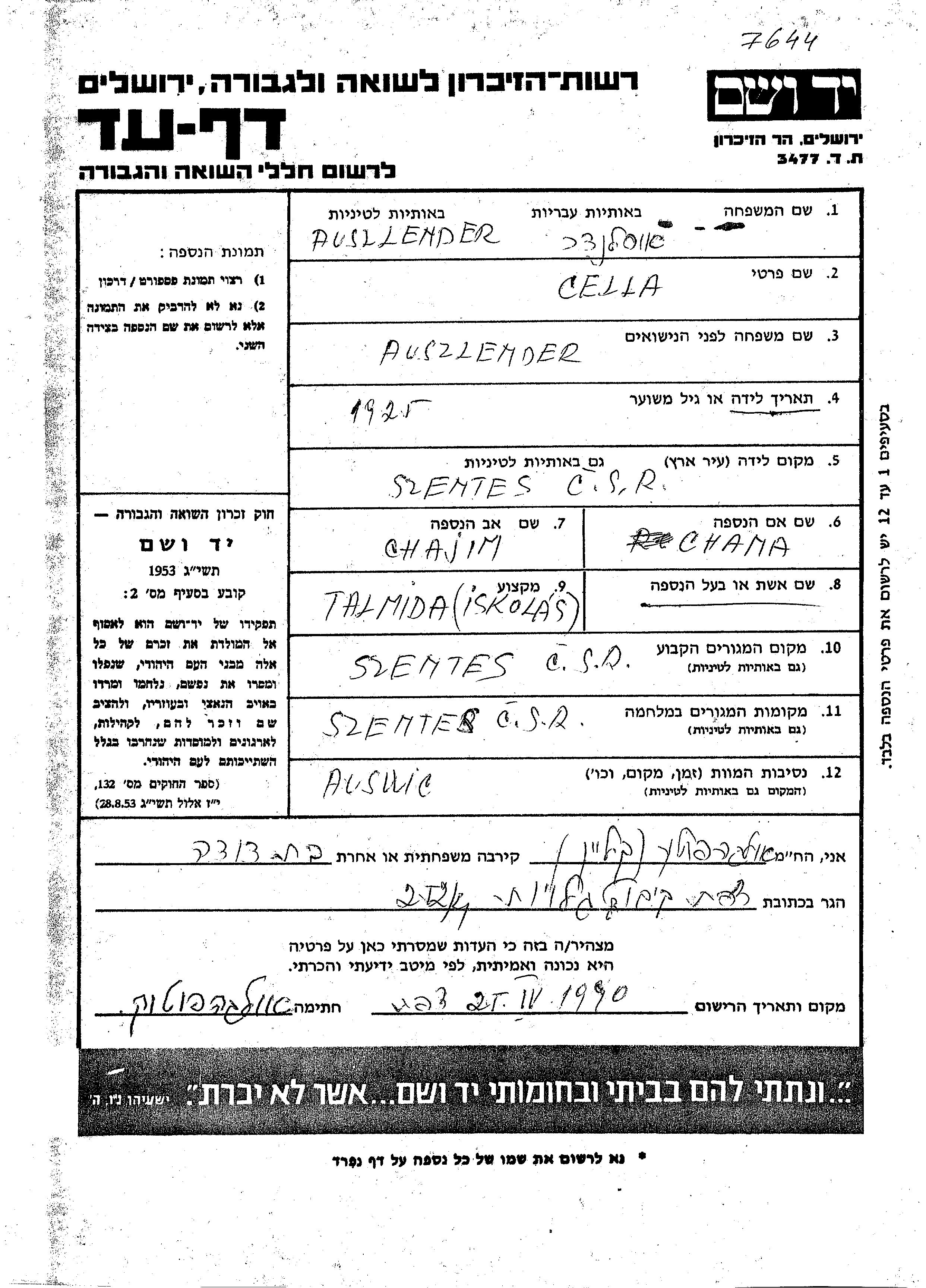Auslender Cella 1925 Szentes, Czechoslovakia Page of Testimony