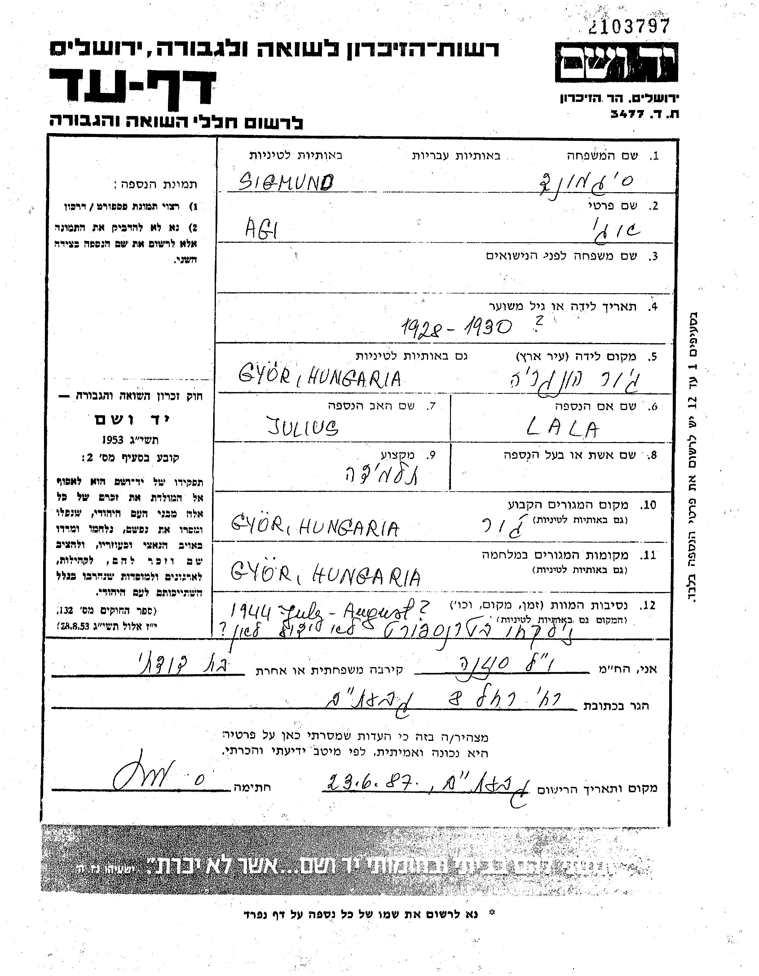 Zigmund Agi Gyor, Hungary Page of Testimony
