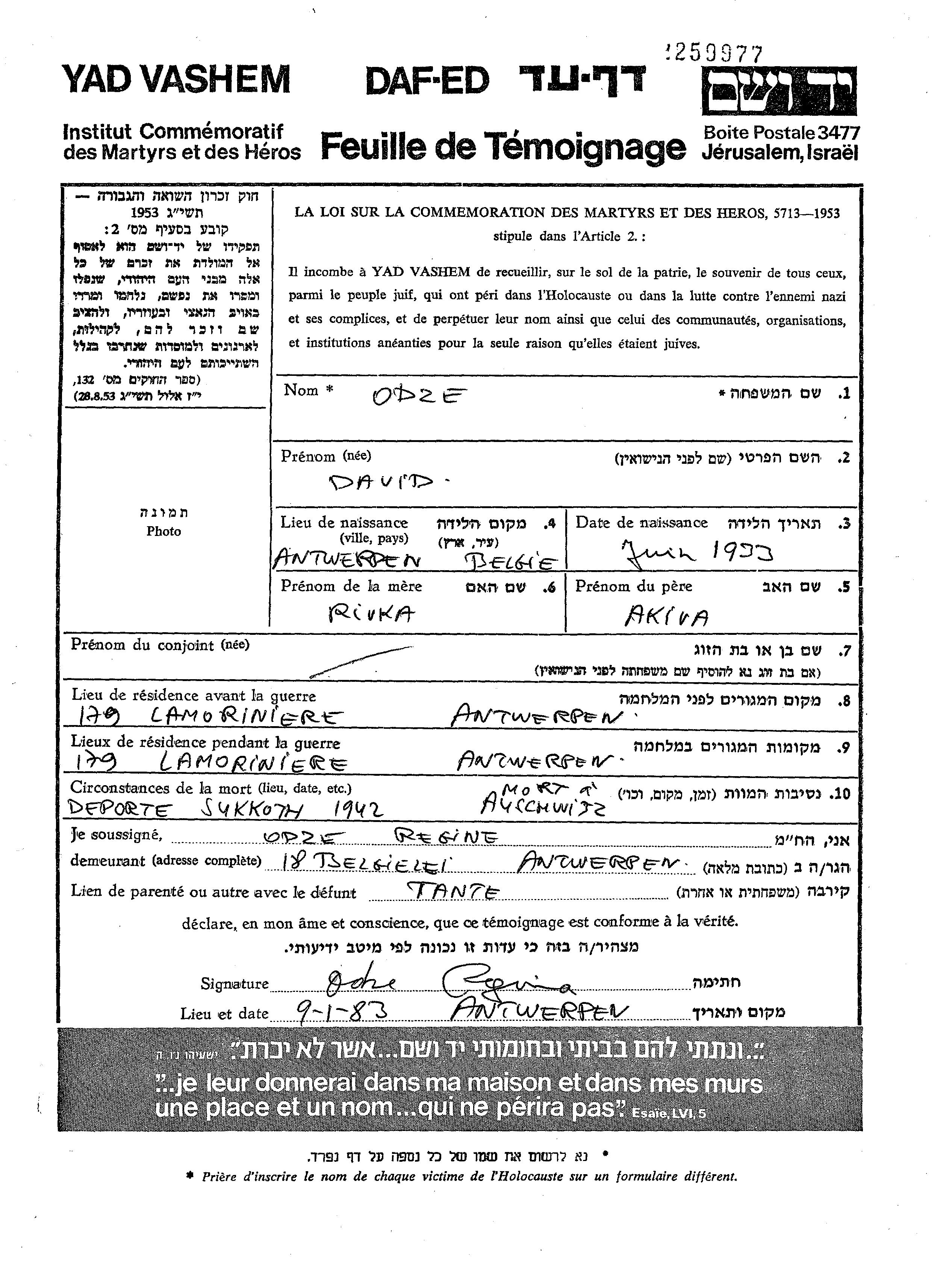 Odze David 1933 Antwerpen, Belgium Page of Testimony