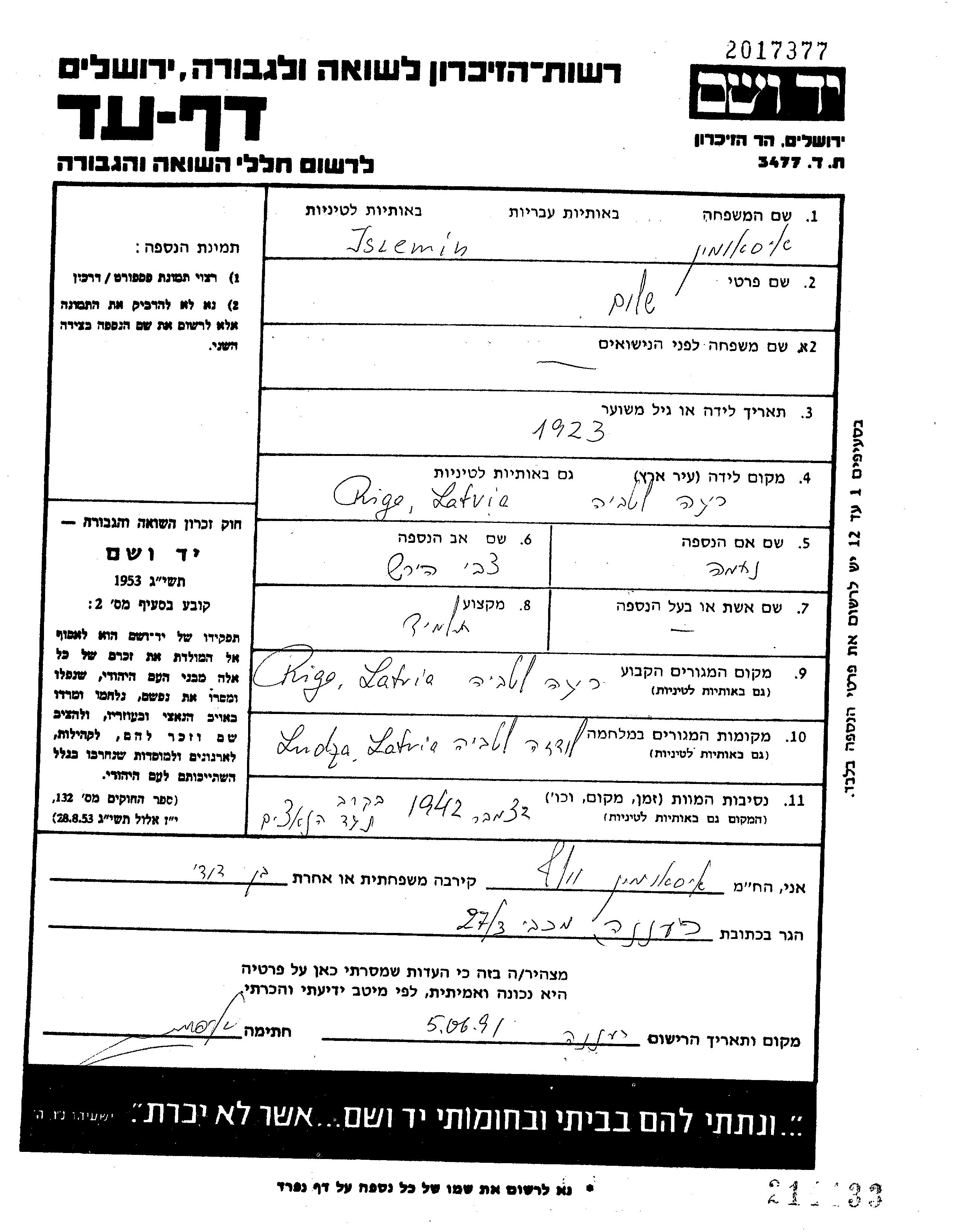 Shalom Isiemin was born in Riga, Latvia, 1923 to Zvi Hirsh and Nechama. He was a pupil and single. Prior to WWII he lived in Ludza, Latvia. During the war he was in Ludza, Latvia. Shalom was killed in military service in WWII. Place of death: unknown, 1942.