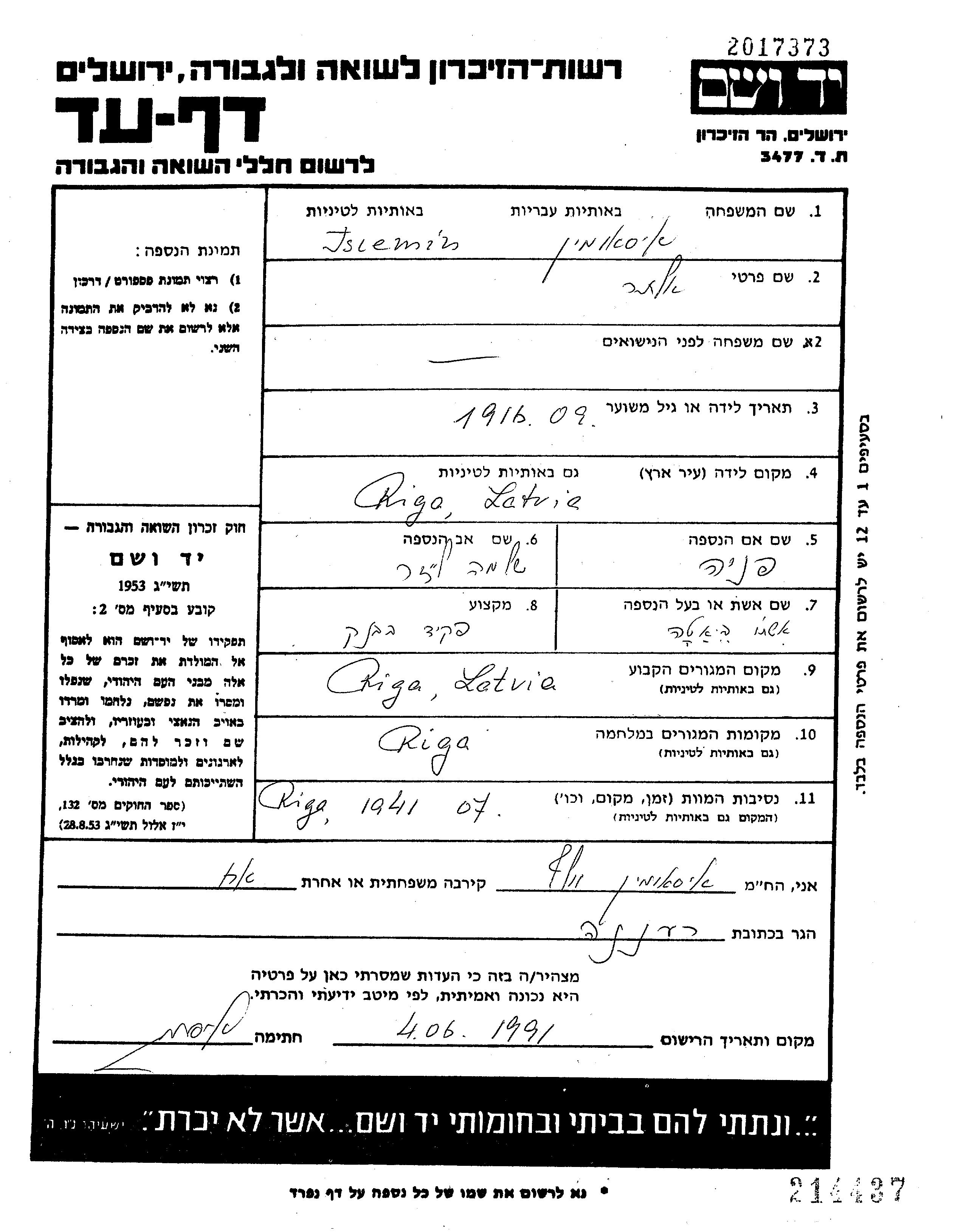 Alter Isiemin was born in Riga, Latvia, 1916 to Shloma Leizer and Fania. He was a clerk and married to Beata. Prior to WWII he lived in Riga, Latvia. During the war he was in Riga, Latvia. Alter was murdered in the Shoah. Place of death: Riga, Latvia, 1941.