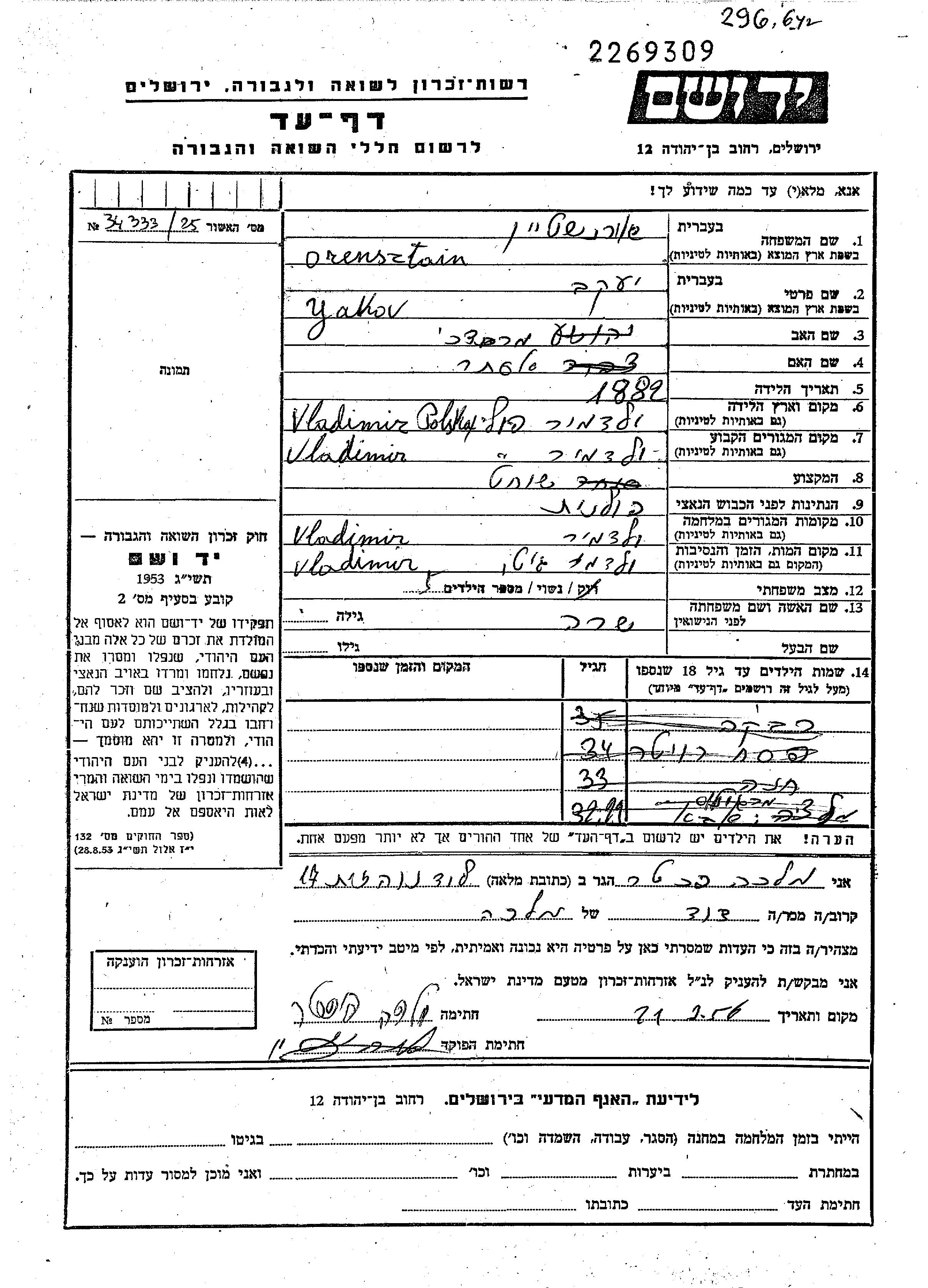 Orensztain Yakov 1882 Vladimir Volinski, Poland Page of Testimony